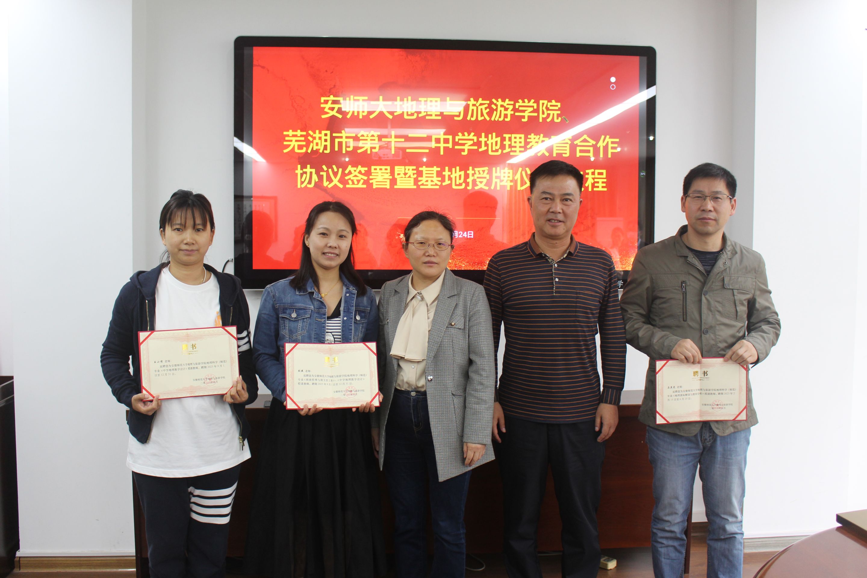 随后,方凤满为马其虎、张燕、王小倩老师颁发聘书、为芜湖市第十二中学实习实训示范基地授牌,并合影留念。