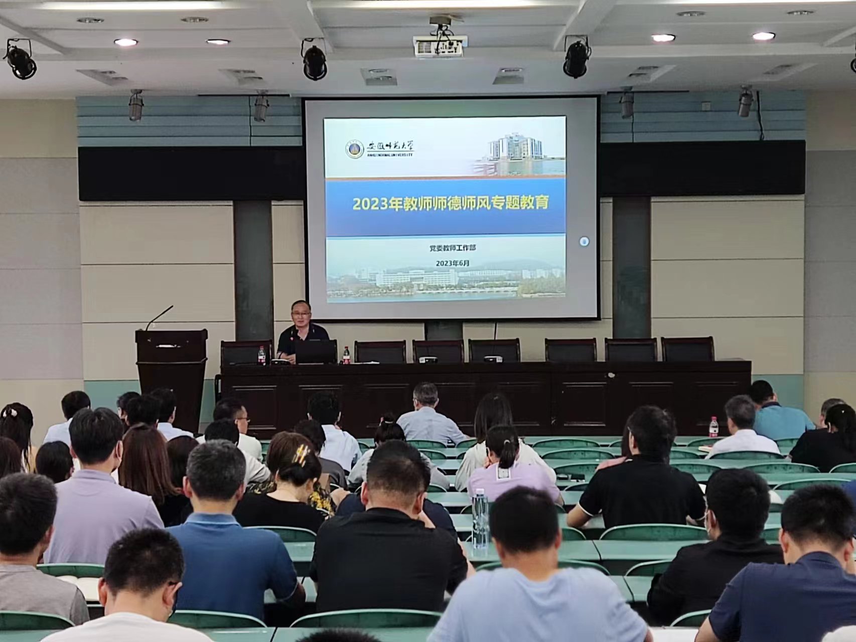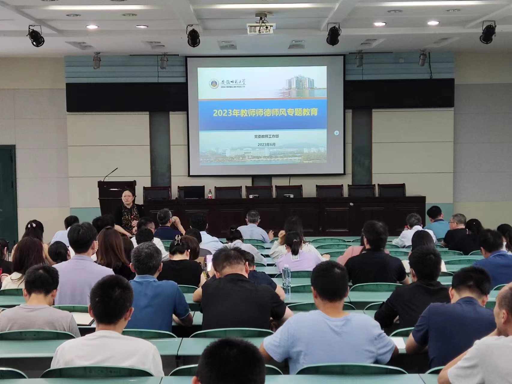 6月21日下午,英国365集团官网在院实验楼101报告厅召开全院教职工大会暨师德师风专题教育。校人事处副处长王标受邀作2023年教师师德师风专题报告,经理方凤满主持,公司全体教职工参加。