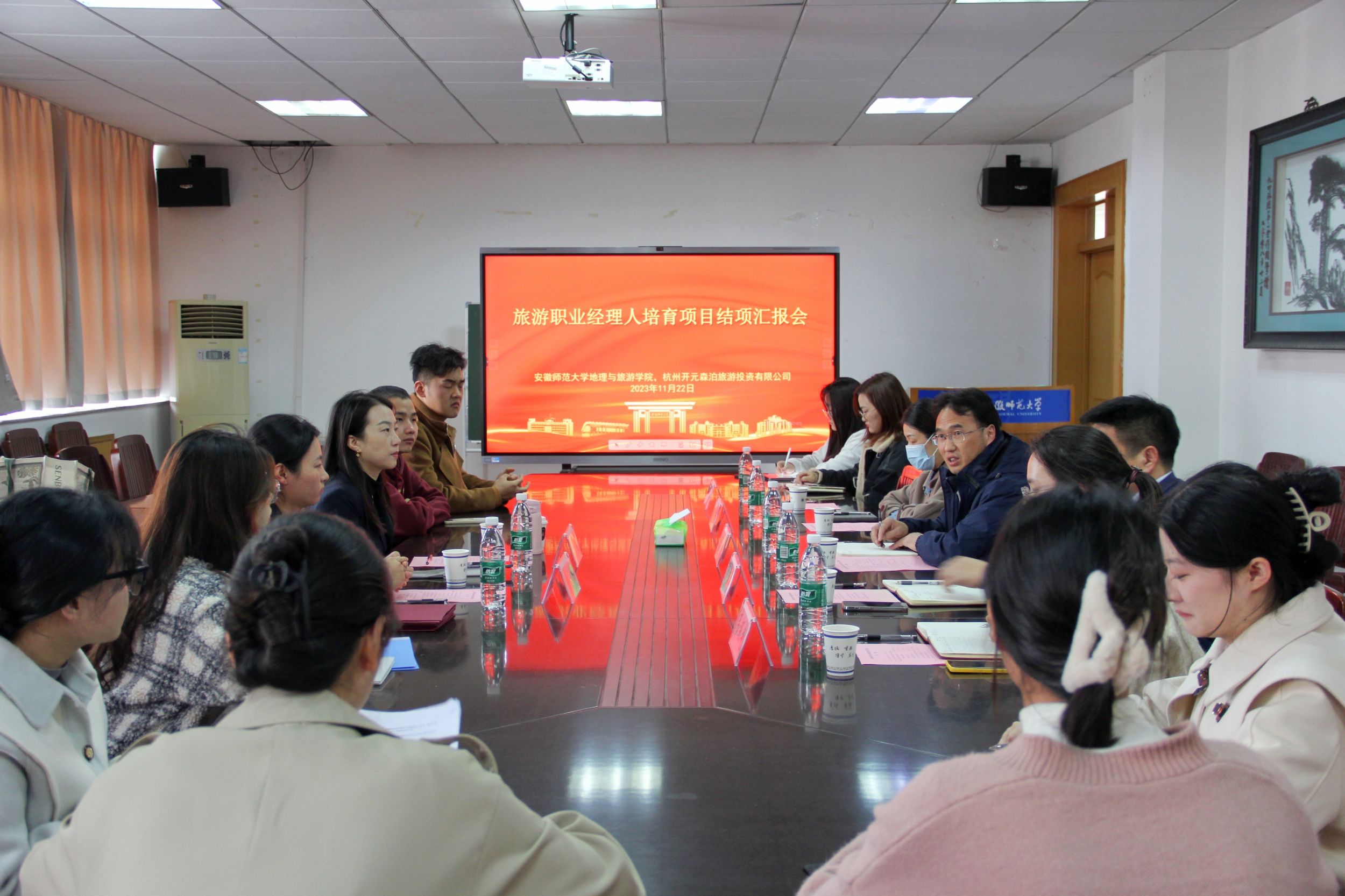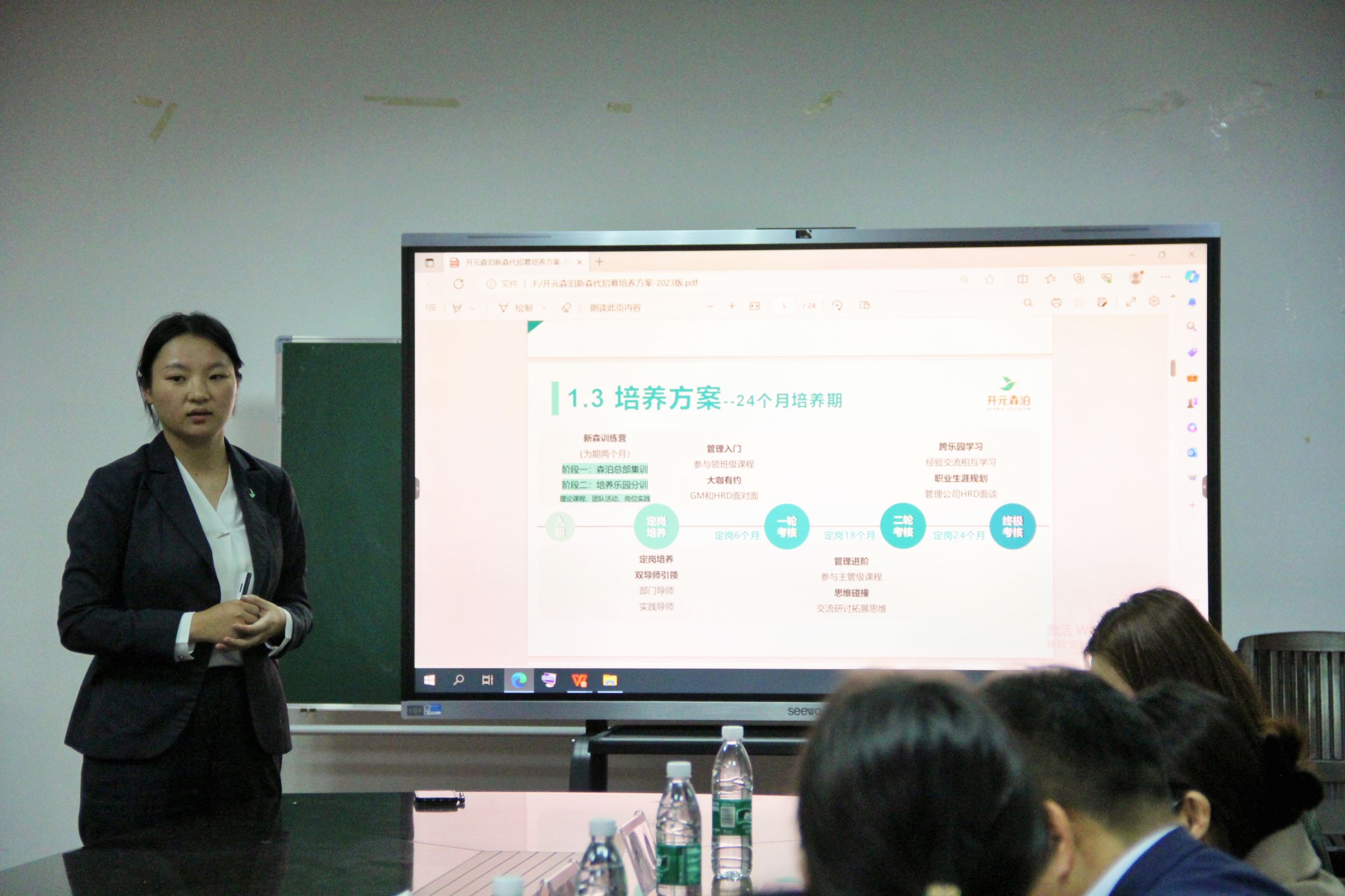陈静总监和尹寿兵老师与职业经理人培育计划项目成员进行座谈,尹寿兵老师教导同学们要积极在旅游行业实现个人价值,为旅游行业奉献自己的一份力量。陈静总监表示森泊欢迎各位优秀的同学加入森泊、加入旅游行业,共同为旅游行业添砖加瓦。最后,吴燕向同学们介绍了开元森泊2024届管培生招聘计划和申请流程,详细介绍了管培生培养模式和成长路径,鼓励同学们选择开元,选择精彩人生。