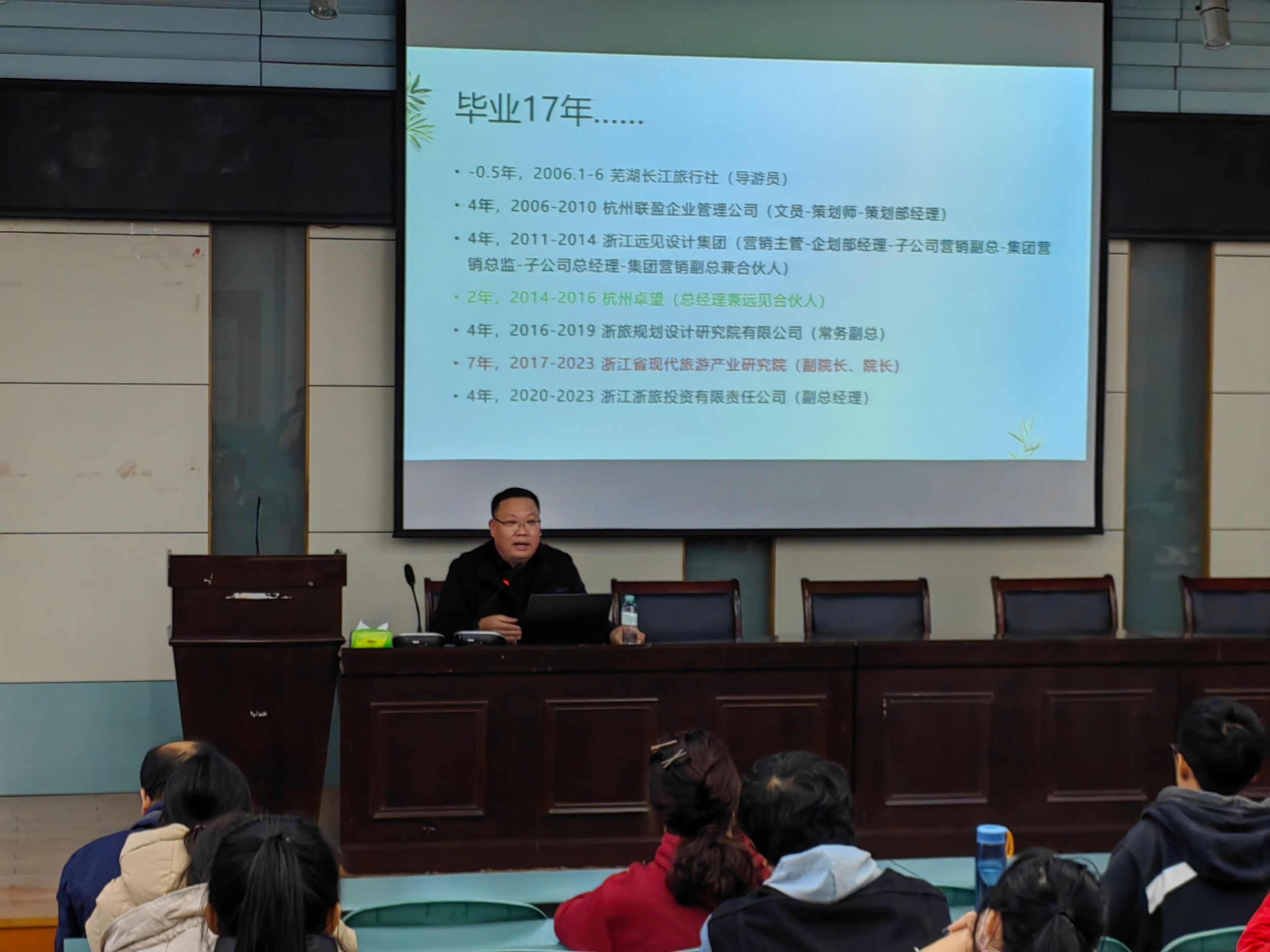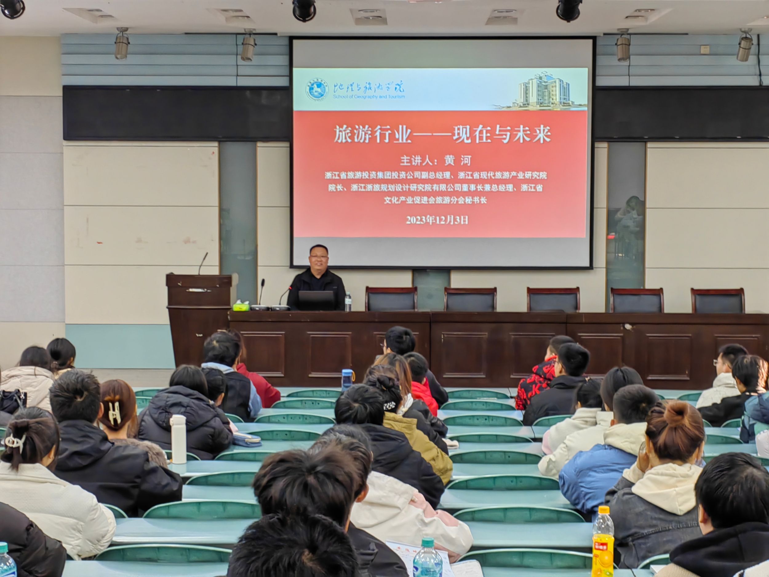 12月3日下午,浙江省旅游投资集团投资公司副总经理、浙江省现代旅游产业研究院经理、浙江浙旅规划设计研究院有限公司董事长兼总经理、浙江省文化产业促进会旅游分会秘书长、2002级旅游管理专业毕业生黄河应邀为地旅学子作题为《旅游行业——现在和未来》的专题报告,旅游管理专业教师代表、辅导员代表、2023级旅游管理专业本科新生参加。专题报告由旅游管理专业负责人杨钊教授主持。