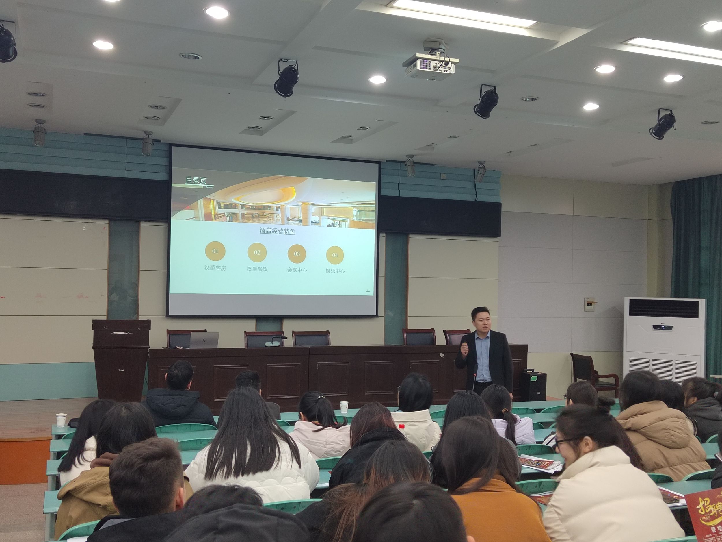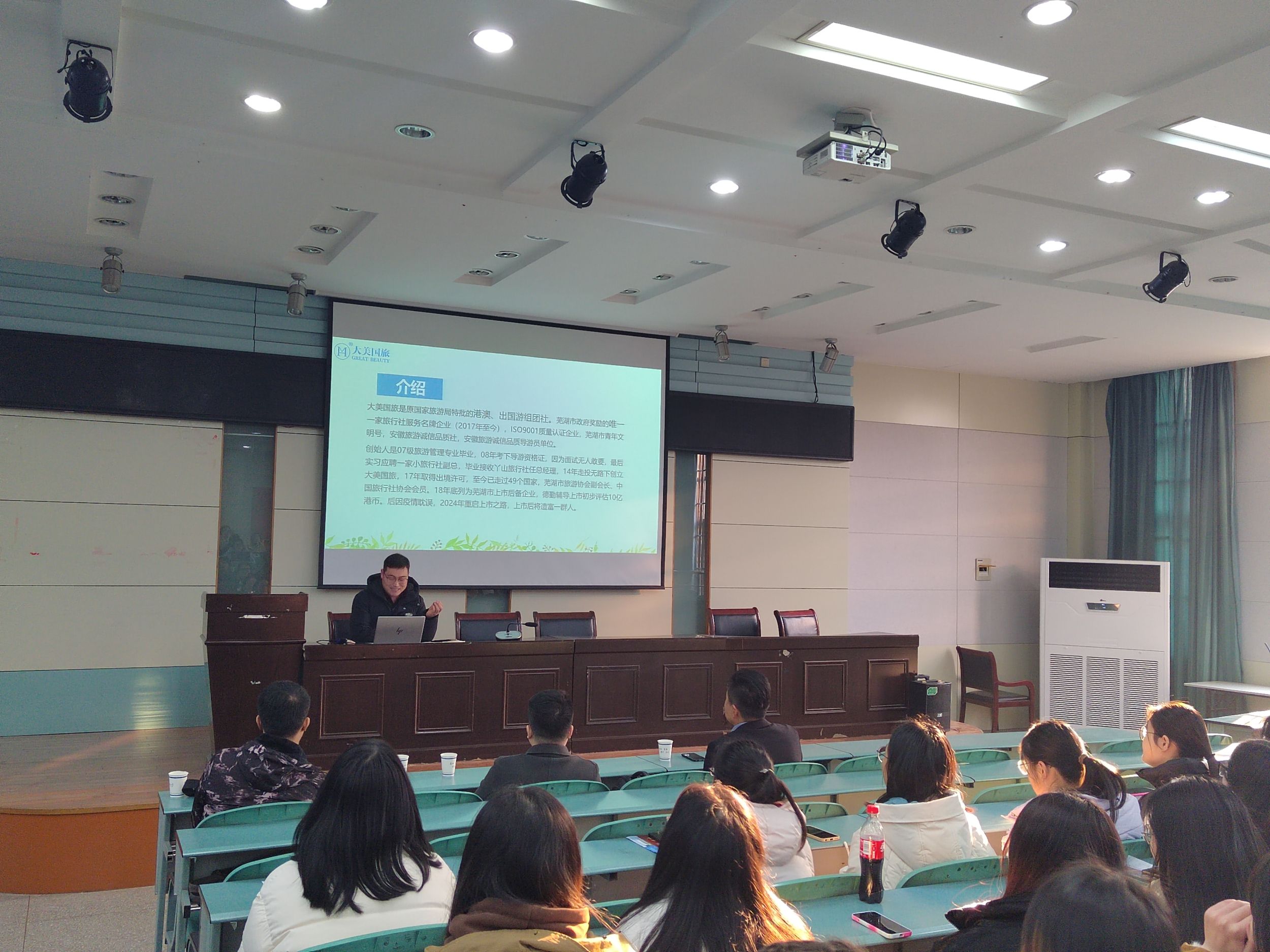 为充分发挥员工资源,深化朋辈教育引领就业,旅游管理专业邀请杭州博行达观文化发展有限公司总经理张松、芜湖汉爵阳明大酒店总经理年磊、安徽大美国际旅行社有限公司总经理邢之鹏三位2011届旅游管理专业员工、现任开元森泊度假区招聘专员的2022届刘浩桐、2023届程杨两位员工前来开展招聘宣讲。员工们结合自身创业、就业经历,向同学们介绍了未来职业发展的可能性和需要思考的问题,同时积极宣传本单位招聘岗位,鼓励毕业生们积极加入。