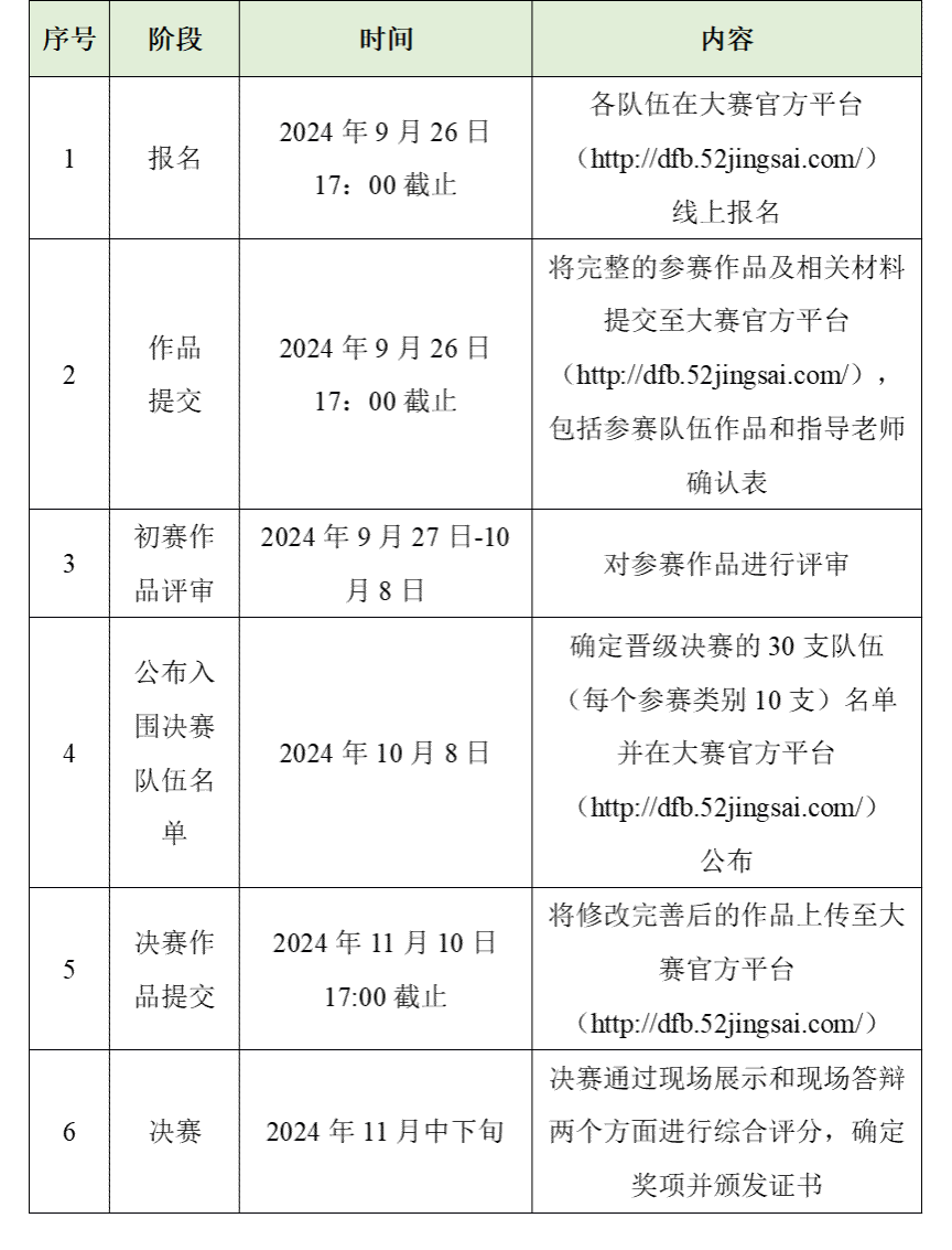 经大赛组委会初赛筛选后,拟遴选出30支队伍(每个参赛类别10支)进入决赛,入围团队需对初赛作品进一步打磨完善,将修改后的作品提交至大赛官方平台,并抵达决赛地参加决赛及颁奖典礼。