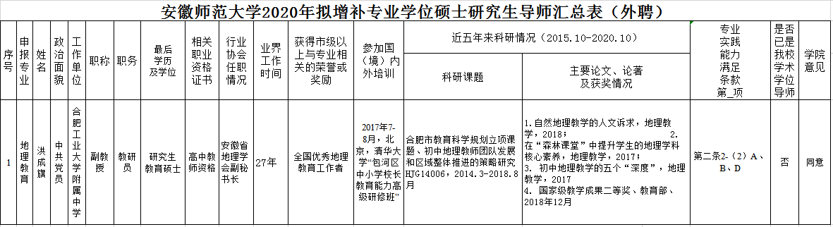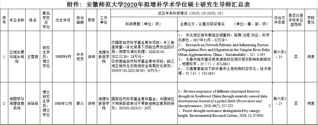 根据校研究生院《关于开展2020年度硕士研究生导师增补工作的通知》(校研字 (2020) 32号)和《安徽师范大学学术学位研究生指导教师遴选办法》(校学位字 (2019) 12号)等文件的精神和要求,公司在坚持公开、公正、公平原则的基础上,通过个人申请和公司教授委员会评审,现确定公司2020年拟增补硕士研究生导师名单。现将名单子以公示。