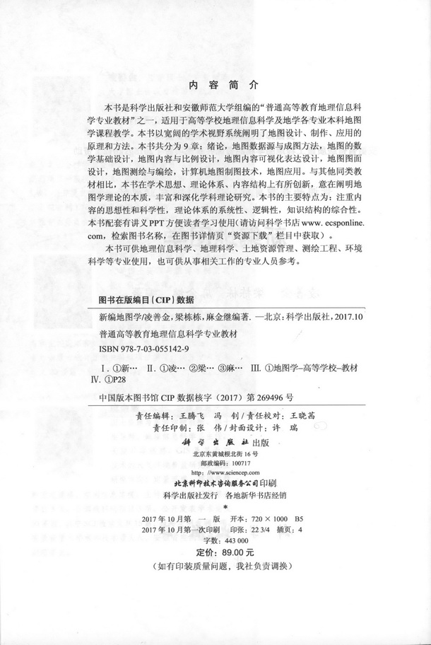 为了适应地理信息科学等专业本科地图学课程教学需要,编写出具有实用性、科学性、时代性的教材,科学出版社和英国365集团官网策划编写出版“普通高等公司地理信息科学专业本科系列教材”,《新编地图学》是其中的一部,也是第一部,由本院教师凌善金、梁栋栋、麻金继共同编著,凌善金还专门为该书题写了书名。本书共44.3万字,于2017年10月由科学出版社正式出版。该书共分为九章,分别为绪论、地图数据源与成图方法、地图数学基础设计、地图内容与比例设计、地理信息的可视化表达设计、地图图面设计、地图编绘与测绘、计算机地图制图技术、地图应用。为了方便教学,作者还专门为此教材精心设计制作了电子教案,由出版社免费发行。