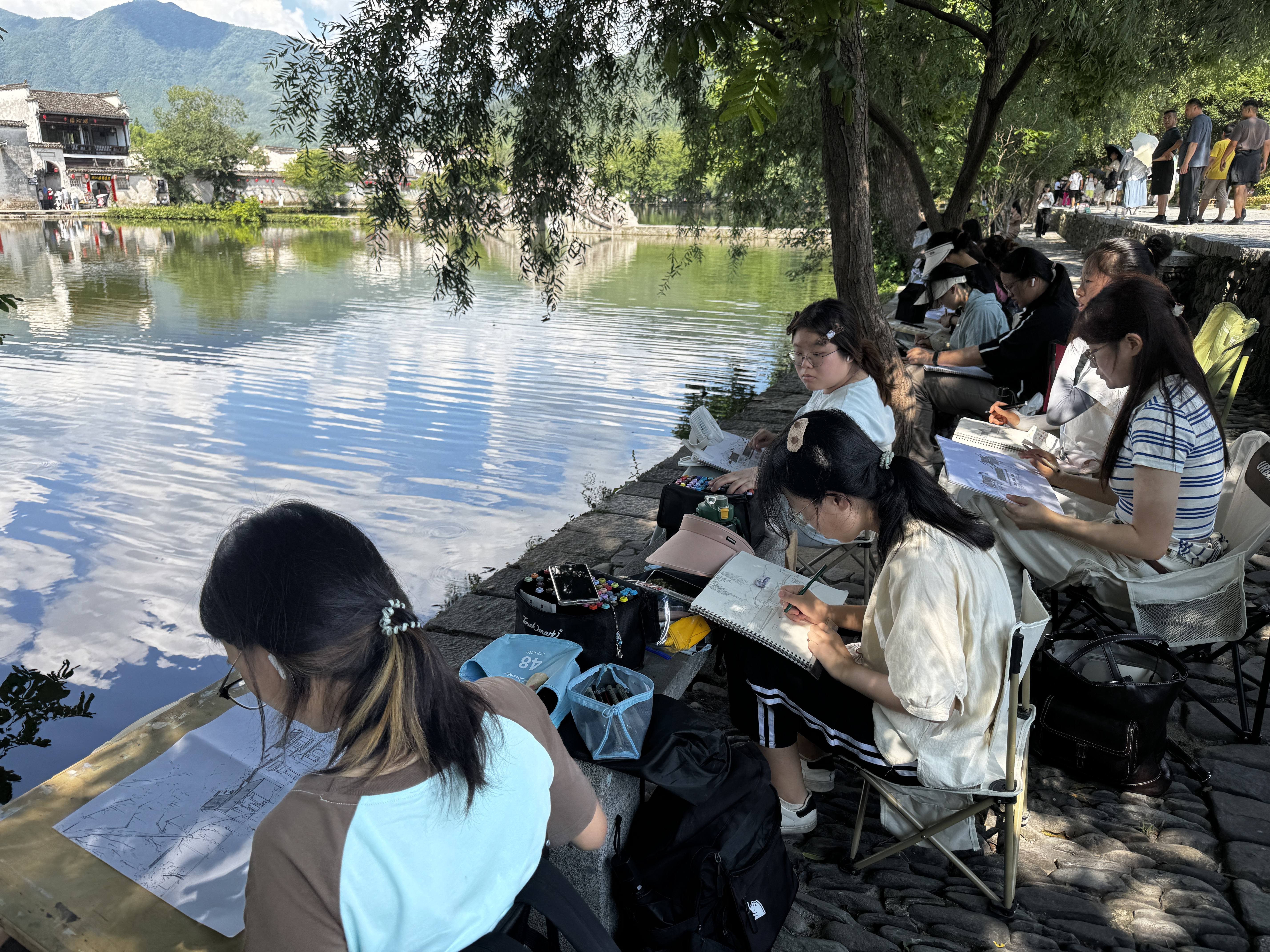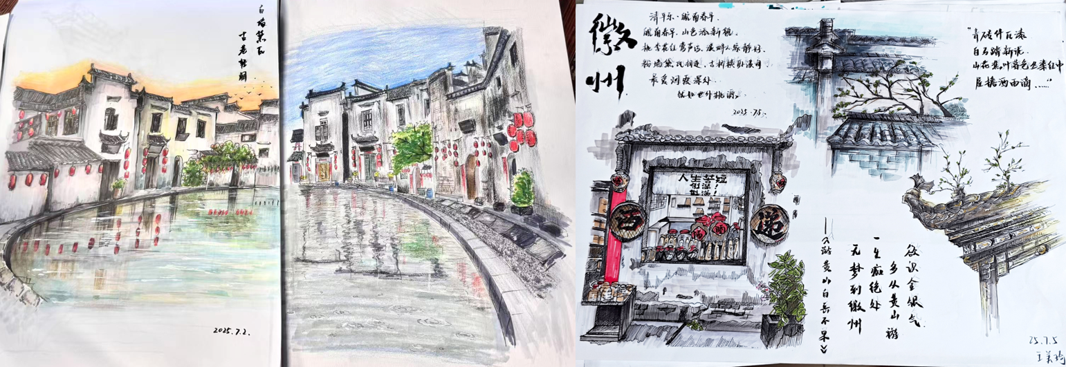 在实地调研过程中,同学们以专业视角审视古村落景观,以手绘方式记录徽派建筑的独特韵味。通过细致观察与写生创作,进一步加深了对传统建筑构成、空间组织和文化意涵的理解。在专业教师的现场指导下,员工们不断提升绘画表现力,激发设计思维,真正实现了课堂知识与实践应用的深度融合。