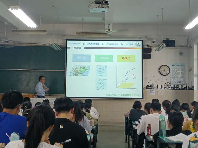 徐光来副教授从某气象站单站高空风图切入,引入本节重点讲解内容:地转风、梯度风、热成风。徐光来副教授详细讲解了为何叫热成风、热成风风速大小的决定性因素、热成风的大小、热成风的方向,并通过2023年4月8日500hPa温度场和等高线示意图,详细介绍了初始地转风于热成风的两类组合形式及四种情景。讲课的内容丰富多彩,思路清晰,课堂教学节奏紧凑,内容生动形象。