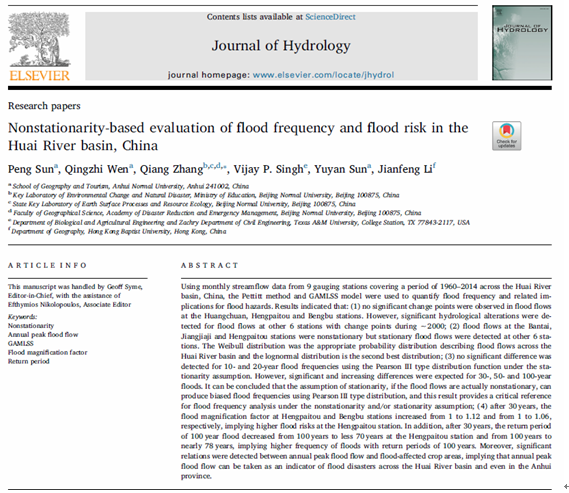 [详见:Peng Sun, Qingzhi Wen, Qiang Zhang, Qingzhi Wen, Vijay P. Singh, Yuyan Sun, Jianfeng Li. Nonstationarity-based evaluation of flood frequency and flood risk in the Huai River basin, China. Journal of Hydrology, 2018, 567, 393-404.]。