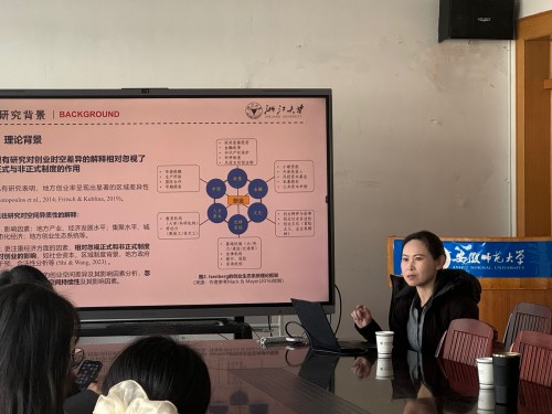 王琛从理论背景开始介绍了创新创业的重要性,并剖析了现有研究对空间异质性的解释,对城市创业率的时空演化特征进行深入分析,讲解了创业空间活动的空间持续性研究的重要性。谈及影响因素时,她旁征博引,点明了区域制度、历史资产、创业文化、重大基础设施和沿海性等因素持续地对创业水平产生影响,深入浅出阐释了各因素的联动机制,为师生们呈现出清晰的逻辑链路。