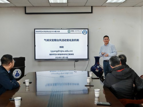 2024年12月14日上午,南京师范大学海洋科学与工程公司博士生导师杨阳教授应邀到公司讲学,并做了题为《气候突变期台风活动变化及机制》的学术报告。报告在公司行政楼四楼会议室举行,公司相关专业的教师和研究生参加了此次报告。