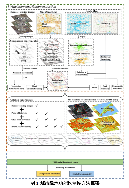 城市绿地(UGS)作为城市生态空间的核心,对支持城市生态系统和可持续发展至关重要,然而当前缺少准确有效的UGS功能区制图方法。本文提出了一种新的方法论框架,通过集成遥感图像、众包地理空间数据(包括兴趣点数据、OpenStreetMap道路网络和百度地图边界)以及深度学习算法,实现了城市绿地功能区精准绘制(图1)。相关研究结果为规划设计者及政府监管部门提供了准确的基础数据源和有效的制图工具,以快速监测、有效管理和科学规划城市绿地功能区(图2)。