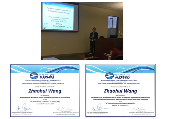 2017年12月7日—15日,公司王朝辉教授研究团队应邀参加了“第二届中美旅游研究峰会”(2nd USA-China Tourism Research Summit and Industry Dialogue)和“第四届世界旅游与接待业研究峰会”(4th World Research Summit for Tourism and Hospitality)以及第四届国际事件会议(4th International Conference on Events),会议在美国佛罗里达州奥兰多市举行。