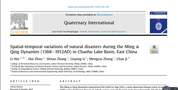 《Quaternary International》是国际第四纪研究联合会官方主办的权威刊物,目前被SCI和A&HCI等收录。国际第四纪研究联合会(INQUA)是第四纪地质学研究领域的一个重要国际学术组织,成立于1928年,旨在推进全球第四纪研究,为该领域科学家提供学术交流平台。本文研究成果详见:Li Wu, Hui Zhou, Shitao Zhang, Linying Li, Mengcui Zhang, Chao Ji. Spatial-temporal variations of natural disasters during the Ming & Qing Dynasties (1368-1912AD) in Chaohu Lake Basin, East China. Quaternary International, 2018, 467: 242-250. 论文下载链接:https://www.researchgate.net/publication/322912539_Spatial-temporal_variations_of_natural_disasters_during_the_Ming_Qing_Dynasties_1368-1912AD_in_Chaohu_Lake_Basin_East_China