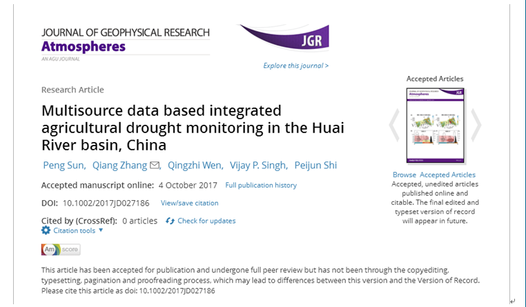 公司孙鹏副教授与安徽省水利厅淮河水利委员会水利科学研究院、北京师范大学减灾与应急管理公司等合作开展的基于多源数据的淮河流域干旱监测模型构建及应用研究,取得重要研究进展,其最新研究成果已在地学领域美国地球物理学会(AGU)主办的国际顶级学术期刊《Journal of Geophysical Research:Atmospheres》上全文发表,影响因子3.454(TOP期刊)。该研究得到国家自然科学基金项目(41601023,51409002)、国家杰出青年科学基金项目(51425903)、安徽省教育厅高校自然科学基金(KJ2016A851)联合资助。