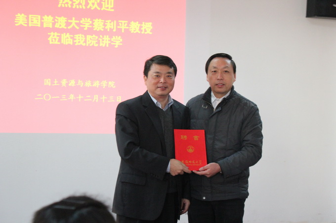 1213日上午,国旅公司在院三楼会议室举行了聘任美国普渡大学蔡利平教授为兼职教授的聘任仪式。聘任仪式由副经理苏勤教授主持,经理焦华富教授为蔡教授发放聘书。国旅公司相关专业教师和研究生参加了聘任仪式。