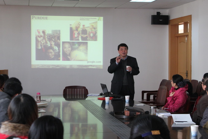 随后,蔡利平教授作了题为《New Global Consumers in Experience Economy》的学术讲座。蔡教授用一口流利的英语,围绕global consumers(全球消费者)、knowledge management(知识管理)、experience economy(体验经济)三个概念阐述,用自己亲身经历对比分析中国和美国消费现象的差异及其原因。着重从四个方面阐述了知识管理的内涵,即社会化(从隐性到隐性)、外显化(从隐形到显性)、综合化(从显性到显性)、内在化(从显性到隐性)。
