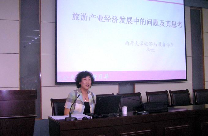 徐虹教授就旅游业产业地位的历史演进、旅游业战略性支柱产业的战略意义、旅游产业转变发展方式的方向、旅游产业融合的障碍因素、旅游产业潜力与竞争力等问题进行了深入的探讨。精彩的报告博得在场师生的阵阵掌声。
