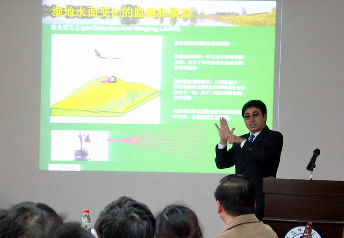 黄胜利博士结合自己的项目和科研成果,做了题为“Wetland Ecosystem Services Evaluation in the Prairie Pothole Regions, U.S.”(美国草原洼地区湿地生态服务评估)的学术报告。报告会上,黄胜利博士在介绍生态服务评估概念和研究区域背景的基础上,详细讲述了如何运用遥感与地理信息技术对湿地水量、水质、生物多样性和碳循环等进行模拟和评估。会后,黄胜利博士就与会教师和研究生提出的地理信息技术和科研模式等问题进行了深入的交流。