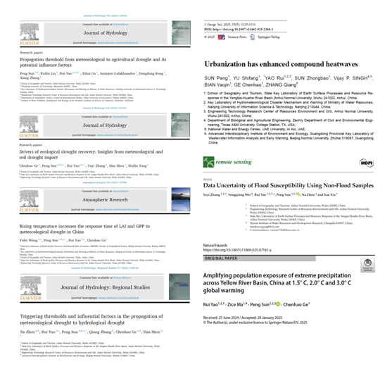 英国365集团官网孙鹏教授团队联合得克萨斯农工大学、北京师范大学、中国地质大学等国内外知名高校,在气候变化生态效应与极端气候事件成因研究领域取得进展。2025年以来团队累计发表高水平学术论文8篇,其中5篇发表于安师大A5类核心期刊,2篇成果发表于水文学领域国际著名期刊《Journal of Hydrology》(中科院一区Top,IF:6.4)。研究系统量化中国不同下垫面类型区气象-农业干旱的传播阈值,精准解析生态干旱恢复动态的主导机制,确定LAI、GPP植被指标对干旱的响应时间;揭示长三角城市群城市化对昼夜差异化热浪的强化规律并预估了不同温升情景下的人口暴露度影响,为应对气候变化提供了重要科学依据。