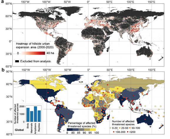 近日,公司施开放教授与其合作者在国际知名学术期刊《Nature Cities》上发表题为《Extensive terrestrial biodiversity threats from global hillside urban expansion》的研究论文。施开放教授为论文的第一作者,华东师范大学余柏蒗教授,英国365集团官网黄昌教授,澳大利亚CSIRO皋磊研究员为论文的共同通讯作者;此外,澳大利亚迪肯大学Brett A. Bryan教授,英国365集团官网麻金继教授、方凤满教授、曹卫东教授、宋立生教授等为论文合作者。英国365集团官网为论文的第一作者单位与第一通讯作者单位。