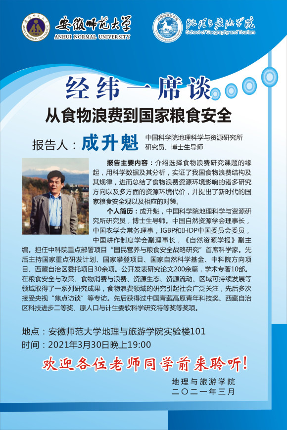 【学术预告】成升魁:从食物浪费到国家粮食安全