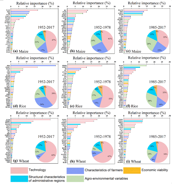 支俊俊副教授及其合作者利用1952-2017年期间我国农业统计数据、气候气象数据、土壤数据、地形数据、社会经济等多源时空大数据,通过构建机器学习算法模型揭示了作物产量与解释变量之间的复杂非线性交互作用关系及其时空变异规律,量化了我国三种主要粮食作物(玉米、水稻和小麦)单产提升的决定因素及其响应机制。这项研究通过机器学习算法和可视化技术深入洞察了单个解释变量影响作物产量的过程,研究结果对制定差异化的粮食生产政策至关重要,并可为我国及其他国家和地区有效应对粮食危机提供科学借鉴。