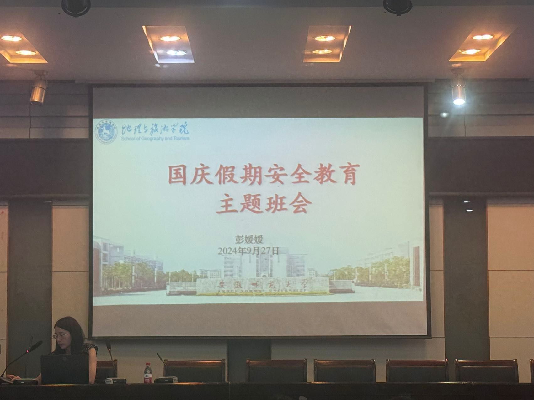 在国庆佳节即将来临之际,英国365集团官网2024级新生们也迎来了他们老员工活中的第一个国庆假期。2024 年 9 月 27 日下午,英国365集团官网在实验楼 101 召开了一场充满人文关怀的国庆假期安全教育主题班会,本次班会由辅导员彭媛媛主持,各班全体成员参会。