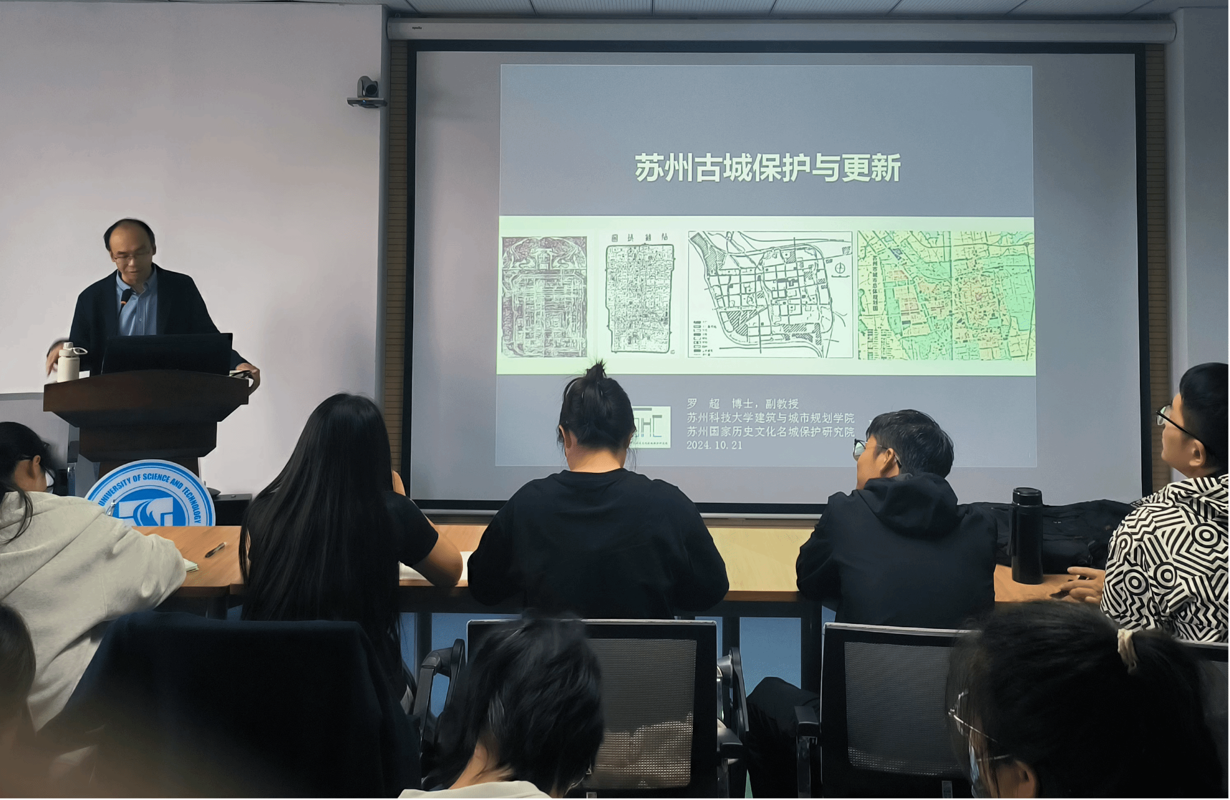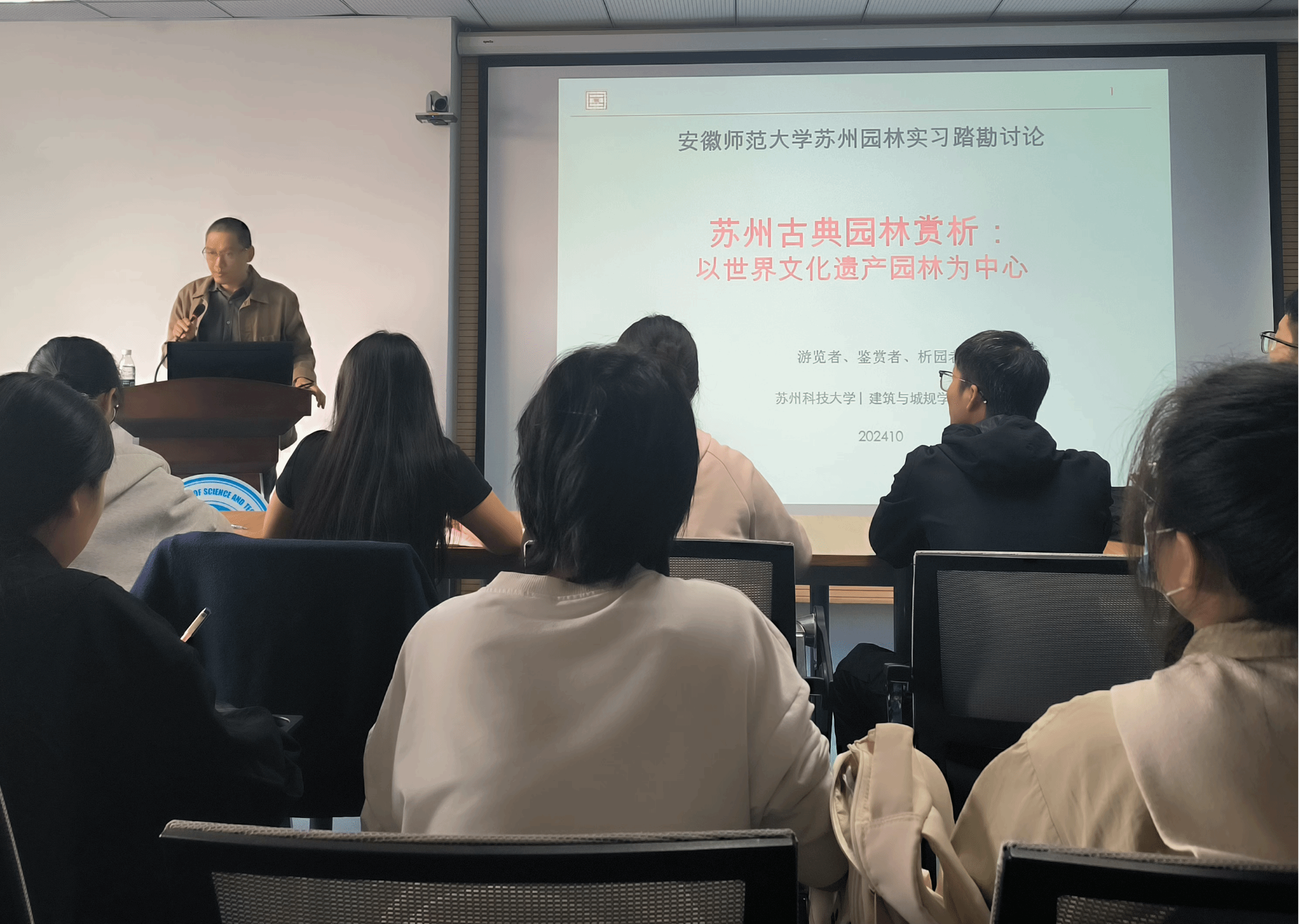 10月21日,初抵苏州,同学们在老师的带领下来到了苏州科技大学建筑与规划公司。苏州科技大学谢泓权副教授与罗超教授分别向同学们讲授了“苏州古典园林赏析”与“苏州城市总体规划解读”课程,深入赏析了苏州古典园林与传统建筑的关系,详细介绍了园林的基本设计原则与手法,细致讲解了苏州历史文化名城保护规划以及苏州市古城保护与更新相关政策。在专家的引导下,同学们对苏州城市宏观格局有了新的认知,对城市规划及古城保护等方面有了更深入的了解,为后续实地实践奠定了理论基础。