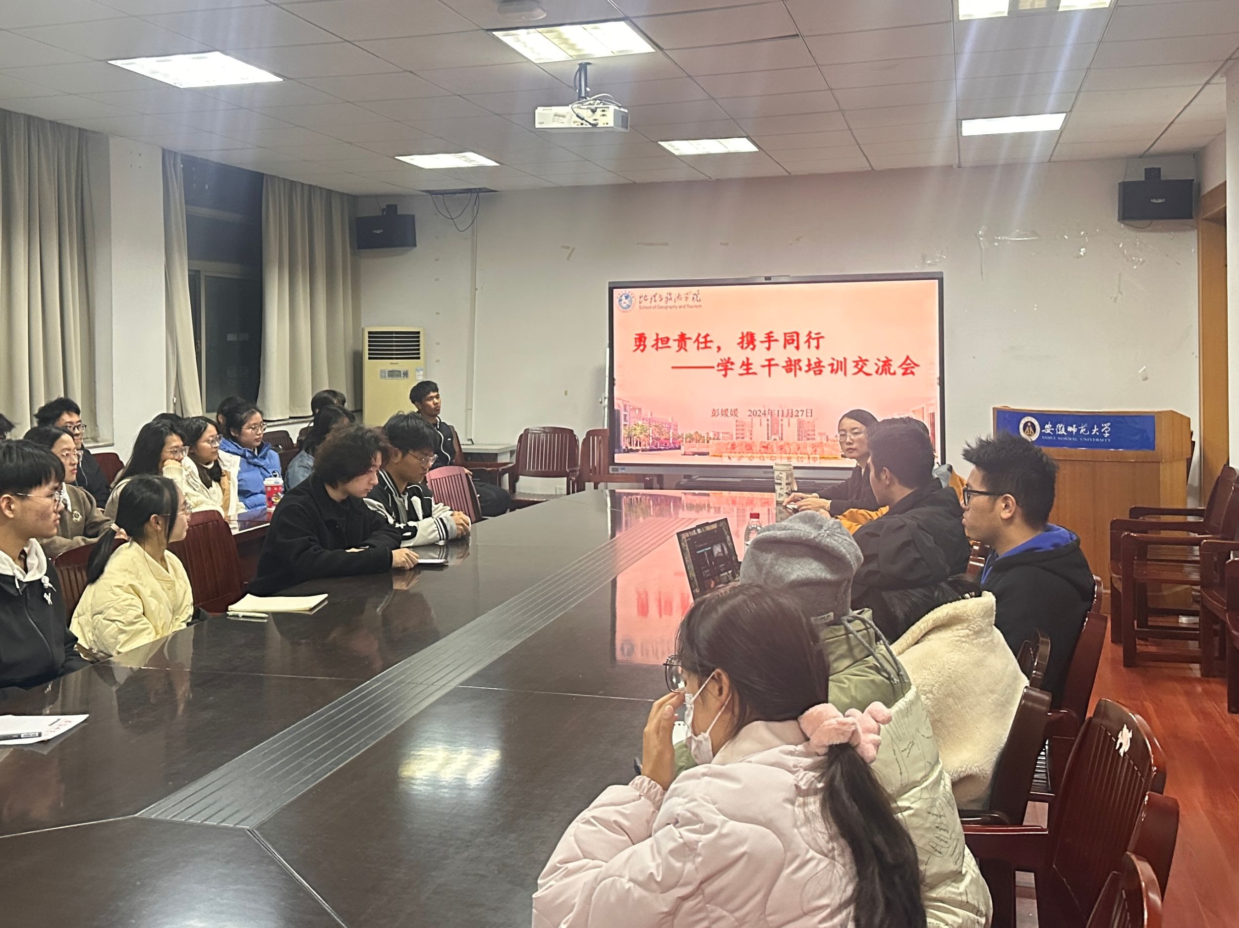 本网讯(英国365集团官网 万思琪、田柏闻)11月27日晚,为帮助员工干部明确职责,提升自我,增强员工组织的凝聚力和工作效率,英国365集团官网在行政楼三楼会议室组织召开员工干部交流培训会,本次会议由辅导员彭媛媛主持,2024级地理科学(师范)、城乡规划、土地资源管理专业各班班委参加。
