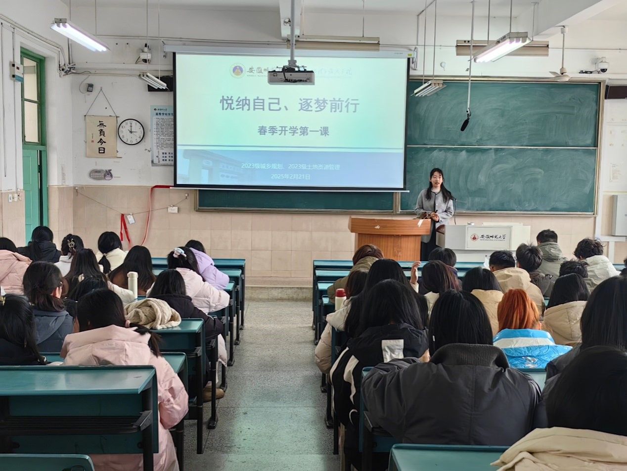 2025年2月21日下午三点,2023级城乡规划和2023级土地资源管理专业的全体同学在2050204教室召开了“悦纳自己、逐梦前行”主题班会暨春季开学第一课,本次班会由辅导员李婷君主持。