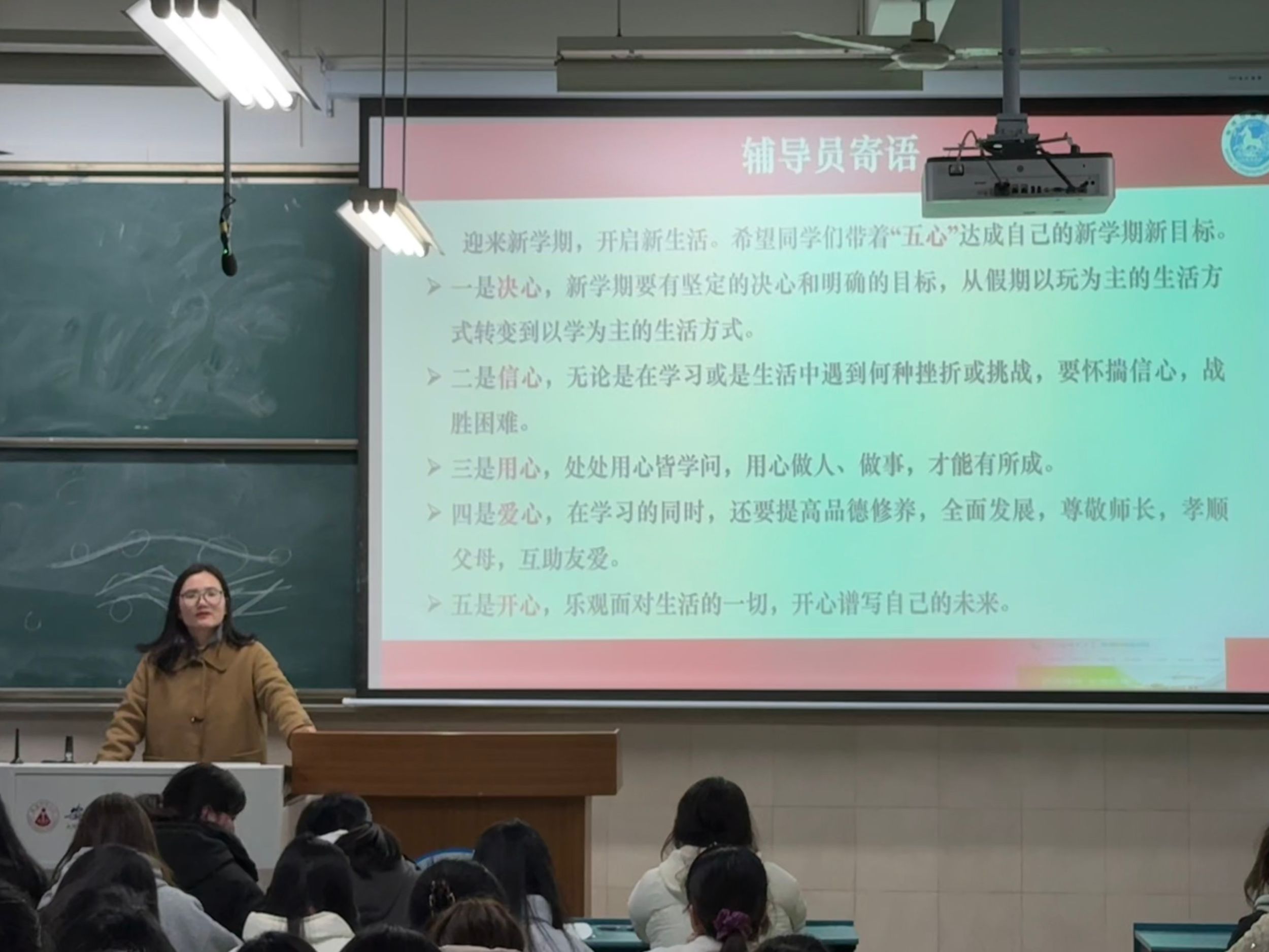 班会尾声,韦银艳寄语同学们:“迎来新学期,开启新生活。希望同学们带着‘决心、信心、用心、爱心、开心’达成自己的新学期新目标。”这五颗“心”饱含着老师对同学们的殷切期望,决心让同学们砥砺奋进,直面困难;信心助力同学们相信自我,绽放光芒;用心促使同学们专注学业,钻研专业;爱心培养同学们关爱他人,融入集体;开心则希望同学们乐观豁达,享受青春。