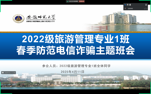 为增强员工反诈意识,筑牢校园安全防线,2022级旅游管理专业1班全体同学在4月11日下午于线上开展“春季防范电信诈骗”主题班会。