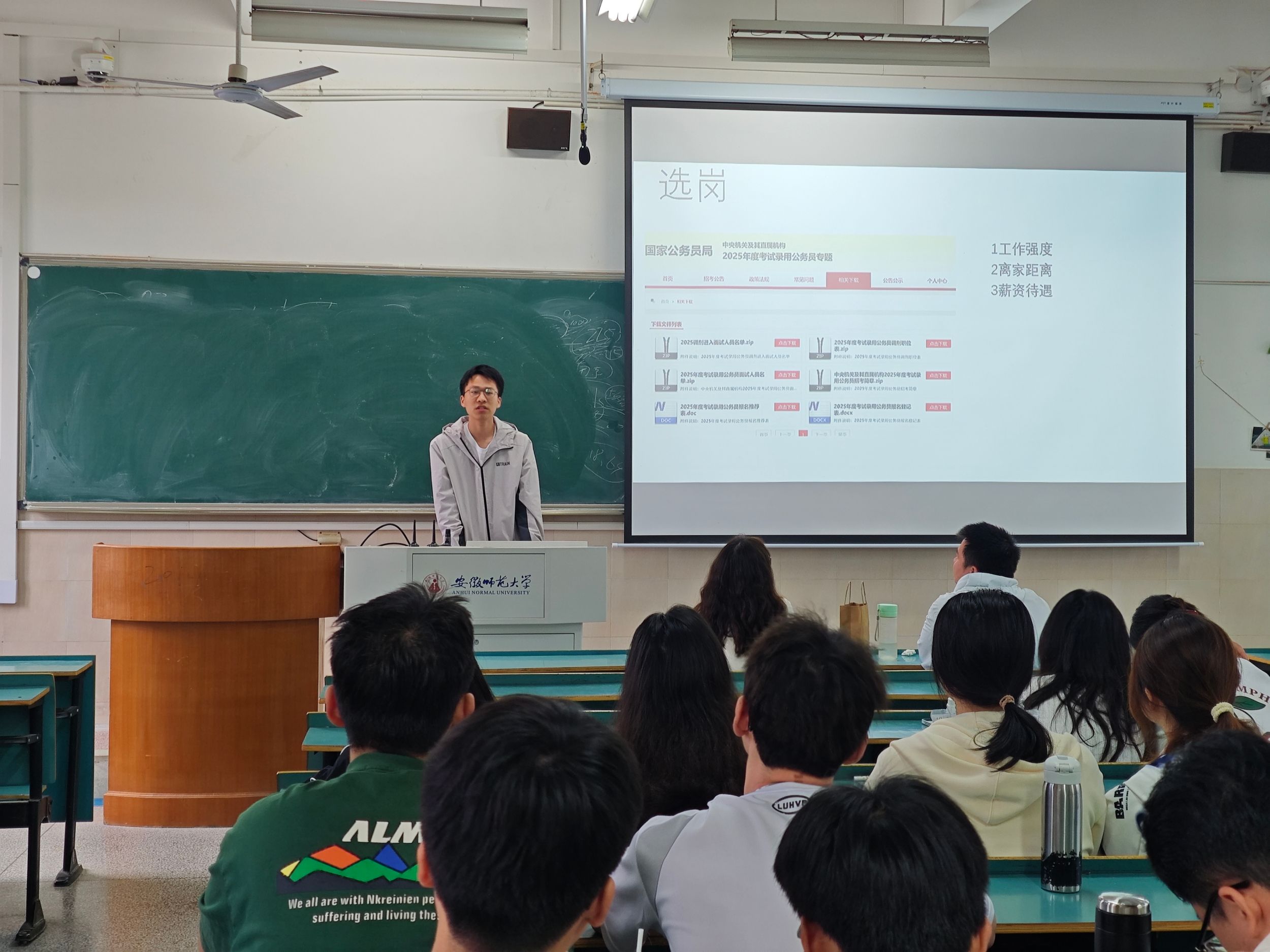 在考研经验分享中,刘鹏程从“如何确定考研院校”切入,详细分享了考研备考期间的时间规划与复习策略,并针对参考书籍和课程选择提出了实用建议。他特别强调,备考过程中应保持良好心态,并让学习成为一种习惯。张纹瑄聚焦考研全流程,分别从初试和复试两个阶段展开介绍。她不仅分享了高效备考的资料与方法,还结合自身经验,详细介绍了复试面试的应试方法和注意事项。李静雨则从考试题型分析入手,系统讲解了公务员考试中不同题型的备考要点,深入浅出地阐述了各科目的复习重点和应试策略,为同学们提供了极具操作性的备考建议。