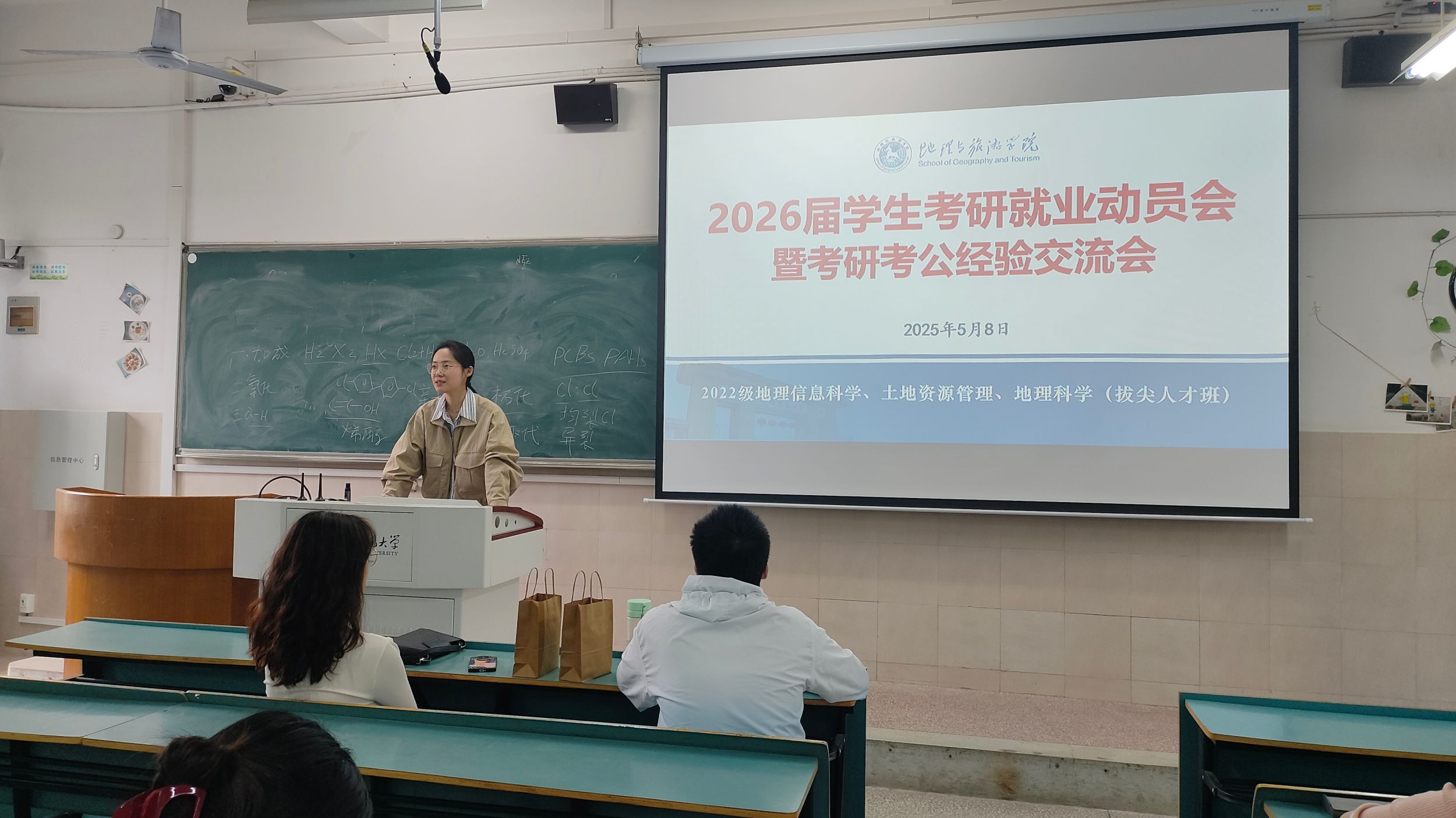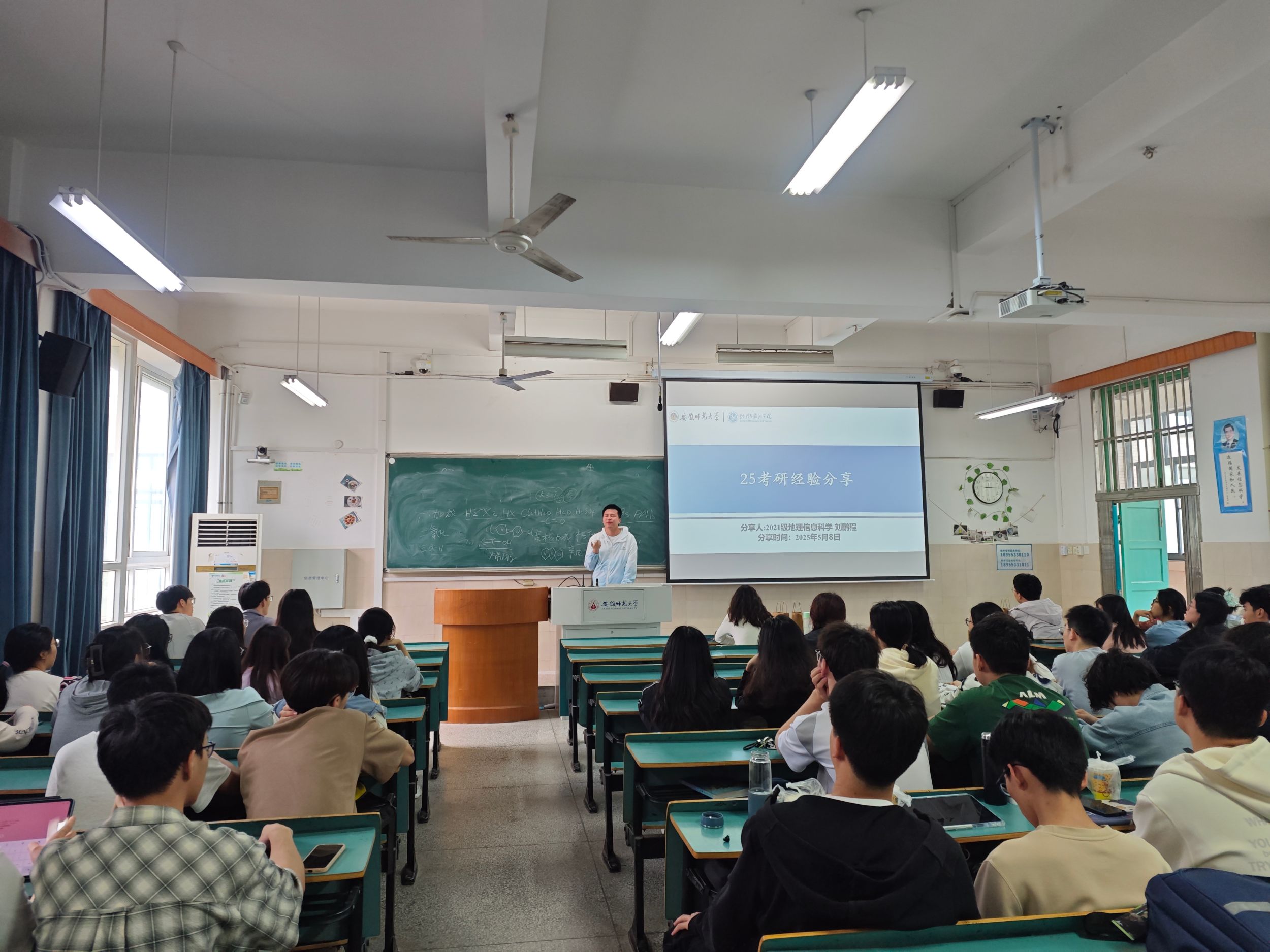 本网讯(魏语菲)2025年5月8日上午9点,2022级地理信息科学专业一班在行知楼2号楼2020101召开了考研就业动员会暨考研考公经验交流分享会。会议由辅导员陈祥云主持,并邀请2021级地理信息科学专业本科生刘鹏程、张纹瑄和2021级城乡规划专业本科生李静雨做考研、考公的经验分享,班级全体同学参加。