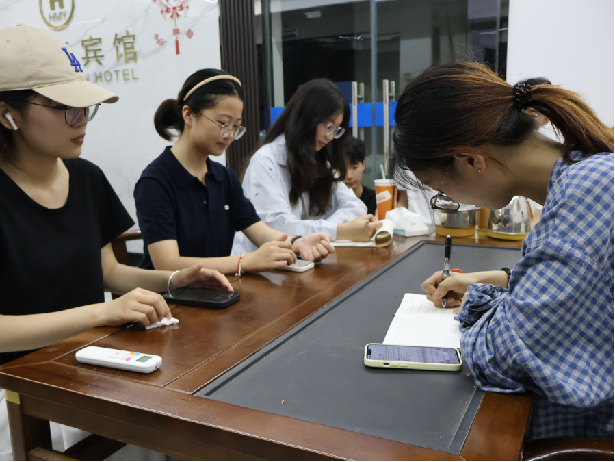 团队在抵达实践地点宾馆后,召开了第一次会议。由实践团队队长施洁对后续工作进行了简要部署,并强调了相关注意事项。