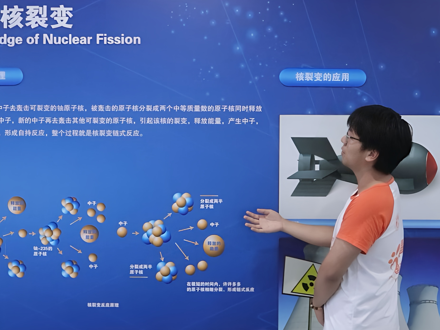7月5日下午2点30分,实践队再次抵达核科技馆,开展志愿宣讲及视频录制工作。6名成员分赴指定展区:核科学奥秘展区由何玉娇、成添添以“从铀原子到核裂变”为主题,生动解析放射性元素的发现历程与核能转化机制;核技术应用展区由李依然聚焦同位素技术应用,结合辐照灭菌、医疗CT等生活实例,展现核科技的民生价值;核安全与环境展区由曾艳通过对比核能与化石能源的环境影响,阐释我国核安全观与绿色发展战略;核科学前沿展区由张婉琪立足“人造太阳”与可控核聚变研究,展望未来清洁能源发展前景。