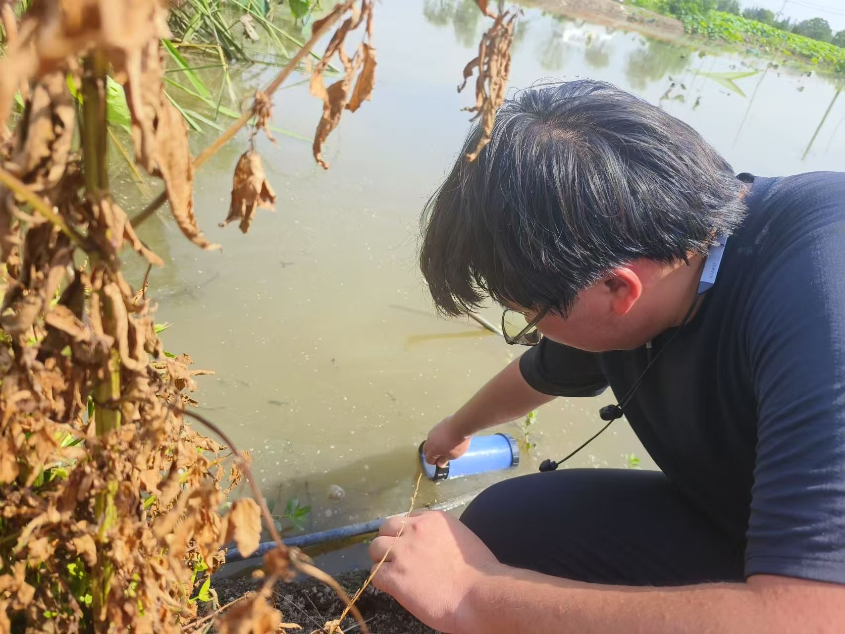在36摄氏度高温中,团队成员在田埂间来回穿梭,汗如雨下。为提高效率,全组成员都加入采样行动,采取各池塘水样进行水质检测,负责记录数据的队员紧盯仪器屏幕,待数据稳定后迅速进行记录。