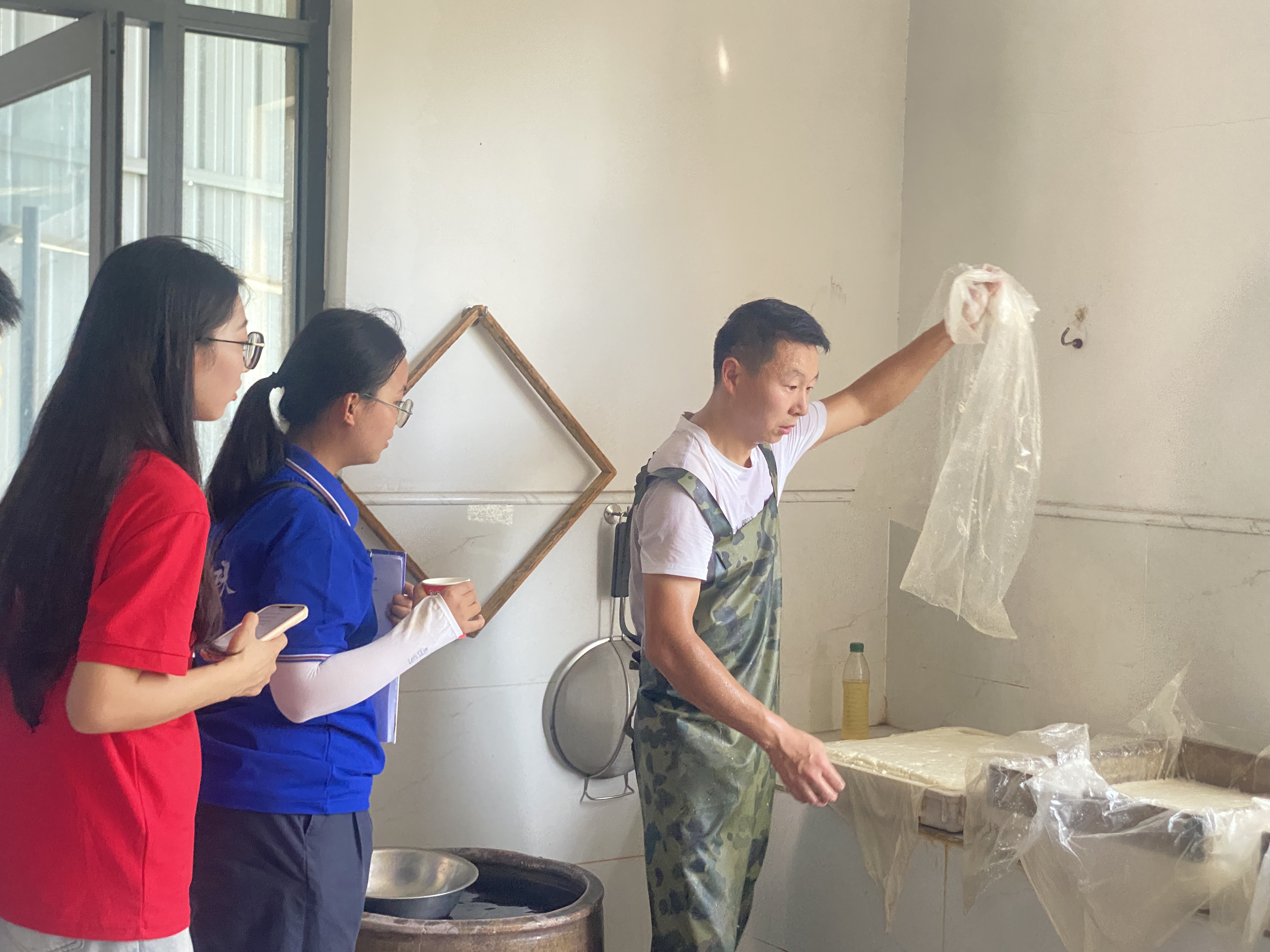 为系统评估八公山作为淮南非物质文化遗产研学旅游目的地的研学路线设计的可行性,7月24日,英国365集团官网“淮畔四时 中州盛宴”二十四节气文化与旅游融合调研本科生社会实践团队走进淮南豆腐主题文化园和八公山乡大泉村,以豆腐传统制作技艺为切入点,通过走访文化园区、对话基层干部、观摩非遗传承,立体化考察非遗保护现状,探寻传统技艺赋能乡村振兴的实践逻辑。