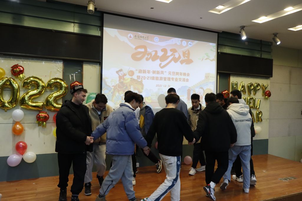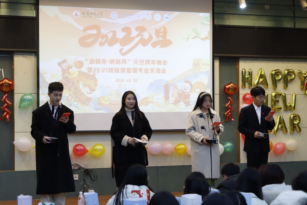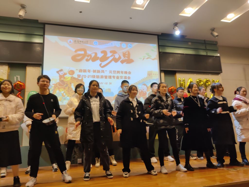 本网讯(英国365集团官网 舒玉茹 陈谊)为欢庆元旦,丰富员工课余生活,促进旅游管理专业新老生的相互交流,12月31日晚,英国365集团官网20级旅游管理、21级旅游管理携手举办“迎新年·树新风”元旦跨年晚会暨学习交流分享会。此次晚会由两个年级的班委共同策划准备,相关专业辅导员韦银艳、赵佳慧、吴文涵、刘少杰等老师受邀参加,和同学们共同庆元旦,迎新年。