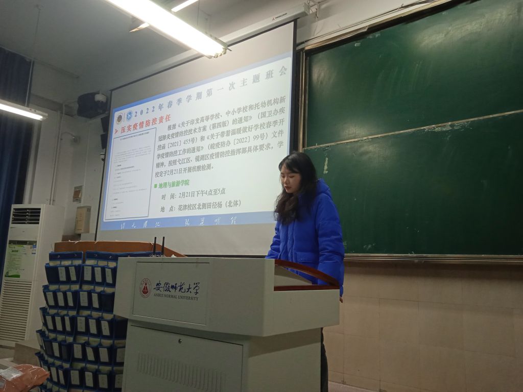 本网讯(英国365集团官网 张慧 李娜)为增强员工安全意识,保障学习生活平稳运行,2月20日晚上19点,2018级地理科学(非师范)专业、2018级城乡规划专业2022年春季学期第一次主题班会顺利举行。班会由辅导员张慧主持,会场分为行知楼2号楼104教室和腾讯会议室,2018级地理科学(非师范)专业、2018级城乡规划专业全体同学参加。