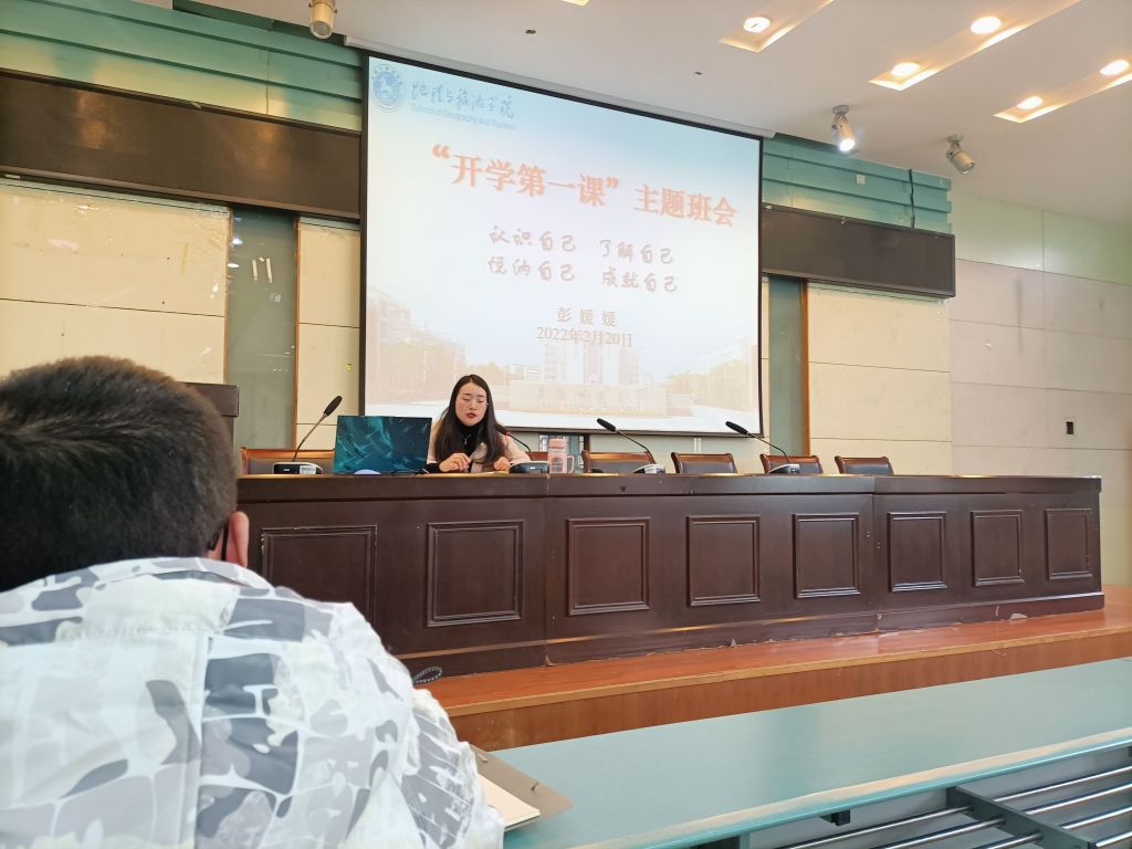 会上,彭媛媛从“认识自己、了解自己,悦纳自己,成就自己”四个方面展开,希望同学们调整好状态,制定好新学期的目标和计划,并就本学期的生活、安全、学习以及班级工作问题对同学们做出了要求和期待。生活方面,彭媛媛鼓励大家尽快调整心态融入公司生活,与室友和同学之间和谐相处,相互包容相互理解以建立良好的人际关系;同时多关注自己的身体与心理健康,课余时间加强身体锻炼,出现身体不适时及时就医;学习方面,要认真安排和规划自己的学习任务,要严格执行手机入袋制度,并提醒部分同学注意重缓考时间和第三轮选课时间;安全方面,彭媛媛针对饮食安全、用电安全、网络安全、交通安全等,要求大家尽量在公司食堂就餐,拒绝违规电器,做到人走断电,提高自身防范意识避免电信诈骗并注意交通安全,尽量不购买不使用电动车,严格执行电动车登基报备制度;特别强调在疫情防控严峻的形势下,坚持“非必要不外出”,严格履行请销假制度,严守“四项禁令”,自觉遵守公司各项规章制度。