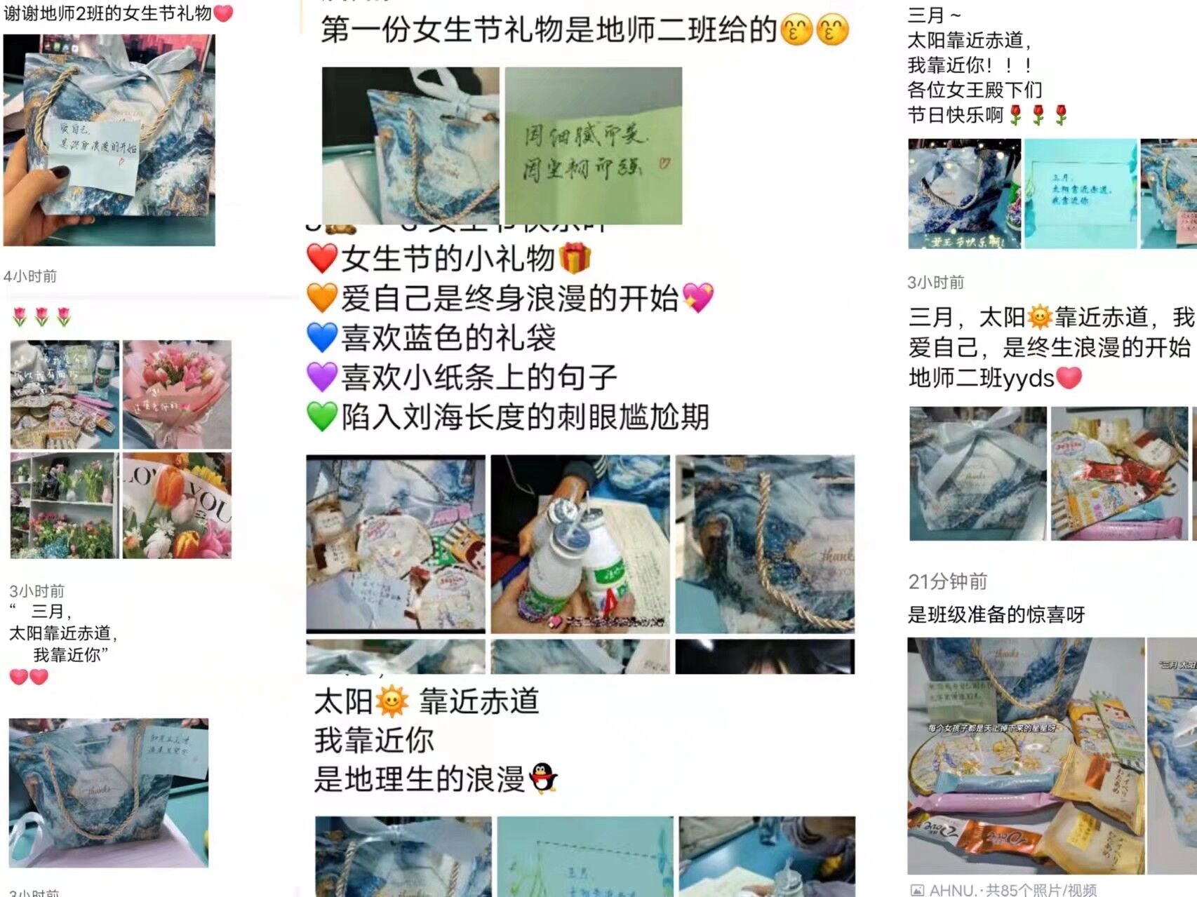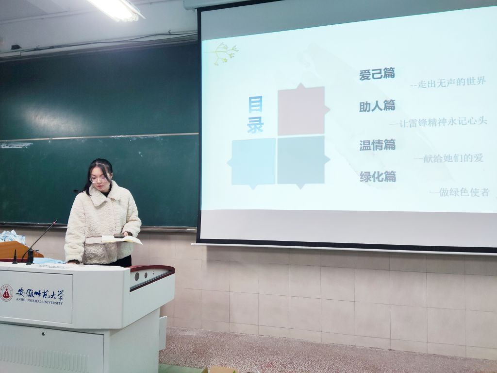 本次活动共分为“爱己、助人、温情、绿化”四个篇章。首先,钟金艳提醒同学们注意春季保暖,预防春季各种流行病,同时也要注意自我调解,预防“心灵感冒”,爱护身心健康。随后,胡珊珊向同学们分享了在“学雷锋日”主题活动中参加敬老志愿服务的事迹,并呼吁同学们积极投身志愿服务工作,弘扬志愿精神,传播爱心火种。接着,钟金艳为女同学们发放了由班级精心准备的女生节礼物,一张张五颜六色的贺卡传递出同学间的关怀、温情。最后,借着阳春三月、大地一片绿意盎然的美好时节,钟金艳呼吁同学们要爱护树木,保护地球上的每一片绿色,并呼吁同学们要逐渐形成人与自然和谐相处的理念。