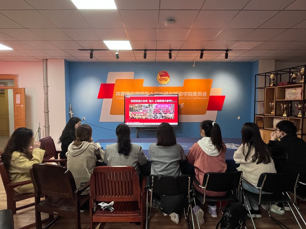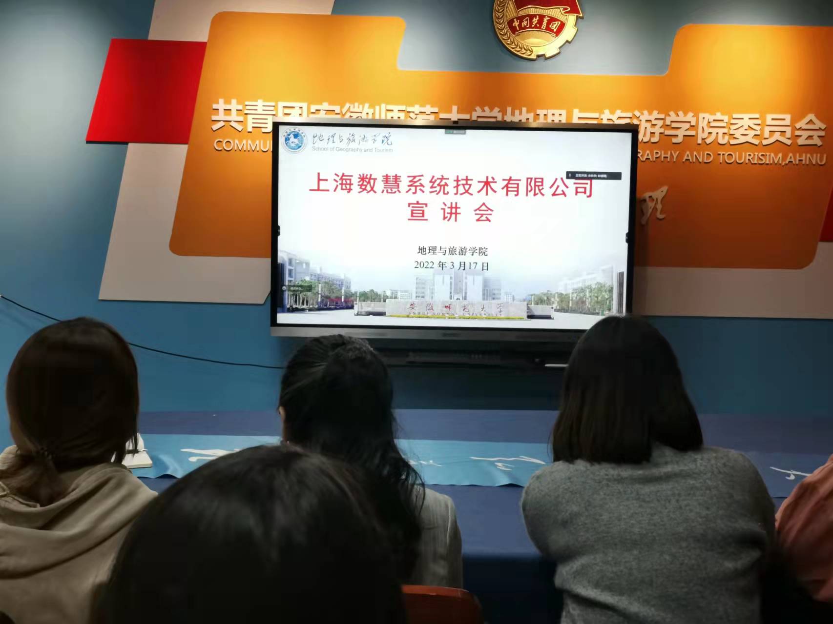 本网讯(孙雯杰 彭媛媛)2022年3月17日下午15:00,上海数慧系统技术有限公司应邀来公司开展“线上+线下”招聘宣讲会,公司负责人使用腾讯会议宣讲,2018级地理信息科学专业员工线上线下参会,会议由毕业班辅导员彭媛媛主持。