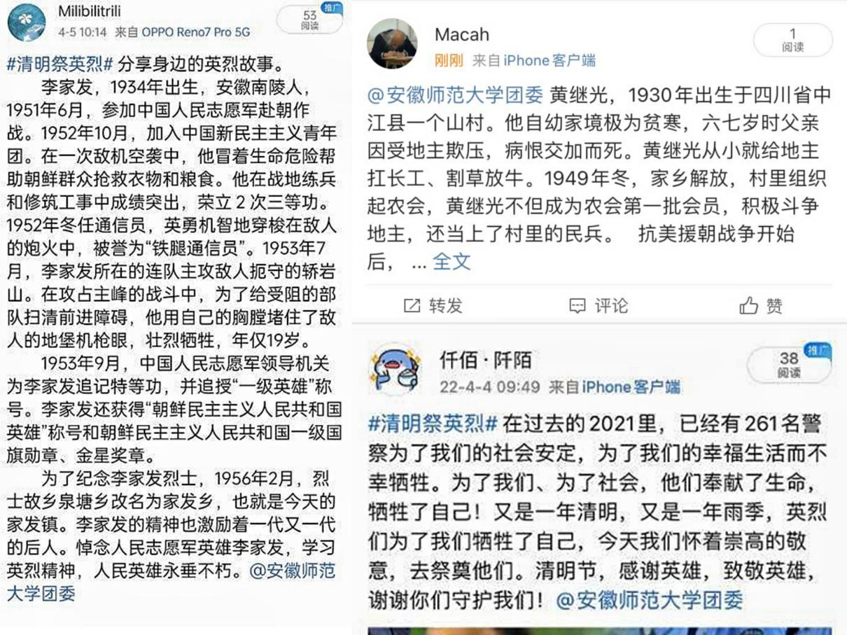 线上活动于4月3日至5日开展,分为两个部分进行。第一部分,团支部号召同学们登录中华英烈网“清明祭英烈”专栏,进行清明网上祭扫英烈活动,同学们纷纷向英烈表达哀思。第二部分,以团小组为单位鼓励同学们通过微博在“清明祭英烈”话题下讲英烈故事、说学习体会,或录制短视频讲述自己所了解的英烈事迹。同学们积极讲述自己家乡的英烈事迹,让更多人了解到家乡的英烈精神。