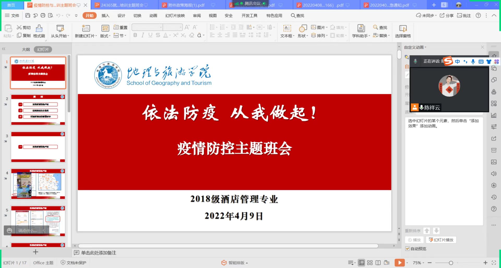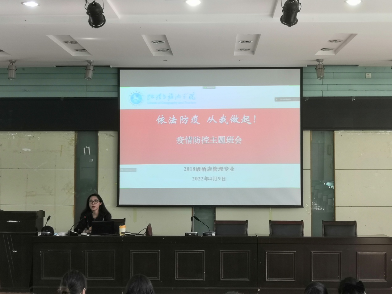 为更扎实做好校园疫情防控工作,4月9日下午,2018级旅游管理、酒店管理、土地资源管理专业分批次在英国365集团官网实验楼101报告厅召开疫情防控主题班会。会议由辅导员陈祥云主持,全体在校员工线下参会,校外实习就业员工通过腾讯会议线上参会。