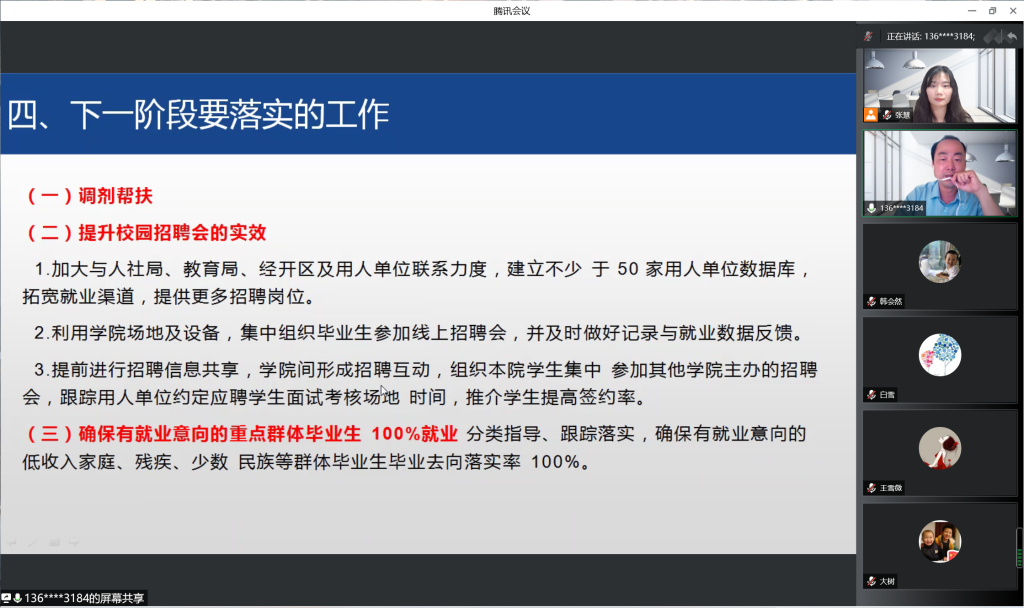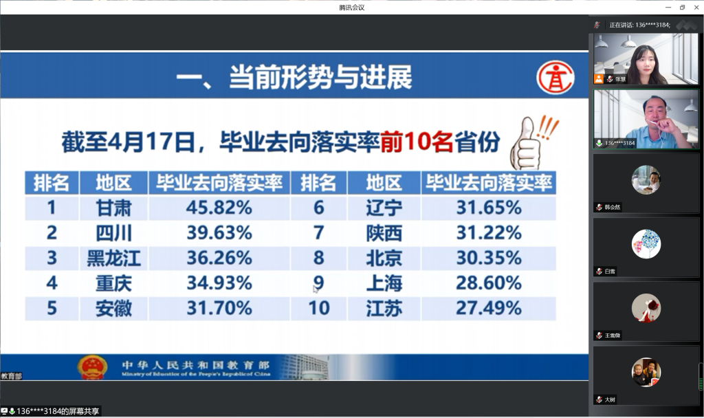 会上,乔静传达了教育部就业调度会议(第三次)精神与公司就业调度会议(第一次)精神,详细介绍了公司公司3月17日以来组织的线上招聘会与成效,具体分析了公司目前的就业形势、存在的困难问题,并明确了下一阶段围绕提高毕业生去向落实率要落实的重点工作。乔静要求帮扶教师,要关心关怀毕业生学习生活和思想心理,发挥就业育人作用,提高人才培养质量,扎实深入帮扶毕业生解决就业难题,为员工顺利落实毕业去向做出积极贡献。