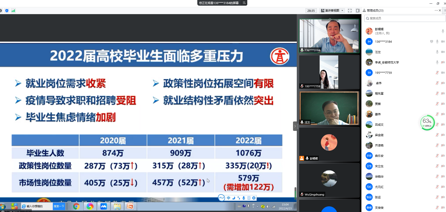 会议第二项,辅导员彭媛媛介绍2022届地理信息科学专业基本情况、列举了员工未就业的原因、详细分析了每一位未落实就业去向员工的具体情况,并就目前存在的困难提出解决方案。