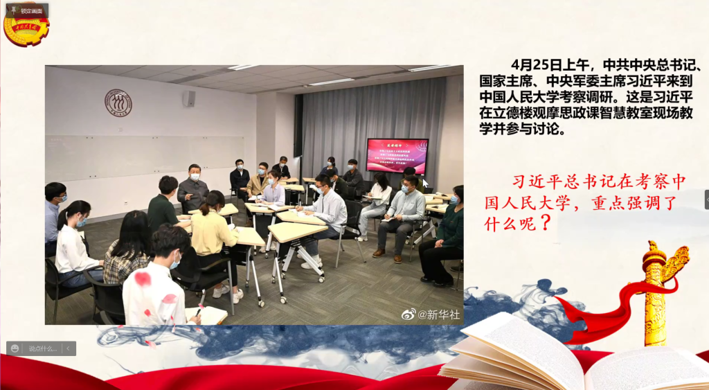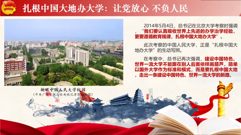 中国人民大学是我们党创办的第一所新型正规大学,历史悠久,具有光荣的革命传统和鲜明的红色基因。2014年5月4日,总书记在北京大学考察时强调“我们要认真吸收世界上先进的办学治学经验,更要遵循教育规律,扎根中国大地办大学。”此次考察的中国人民大学,正是“扎根中国大地办大学”的生动写照。2022年4月25日,习近平总书记专门参观了中国人民大公司史展。他强调,一定要把这一光荣传统和红色基因传承好,守好党的这块重要阵地。