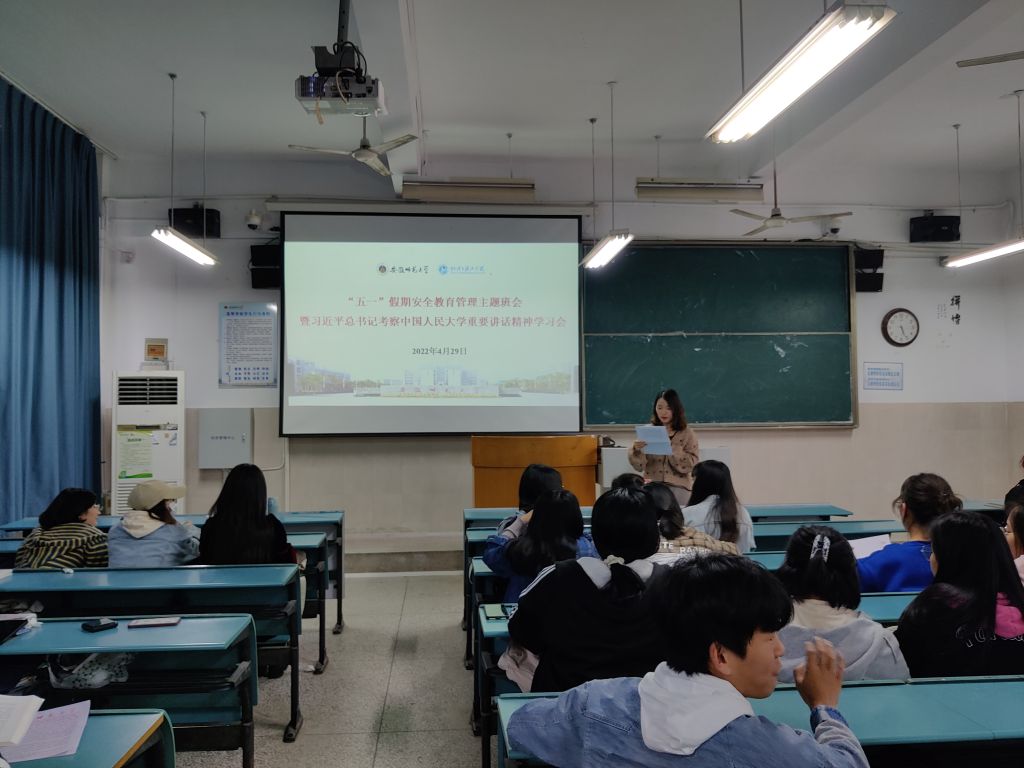 在五四青年节即将到来之际,习近平总书记到中国人民大学考察调研,向全国各族青年致以节日祝贺,并对广大青年提出殷切期望。4月29日,辅导员赵佳慧老师组织开展了“学习贯彻习近平总书记考察中国人民大学重要讲话精神”专题学习会,与会师生畅谈对总书记重要讲话精神的学习心得和感悟。团支部书记徐雨菲表示会牢记总书记谆谆教导,坚定不移听党话、跟党走,将学习与实践结合起来,在为同学服务的过程中展现应有作为。