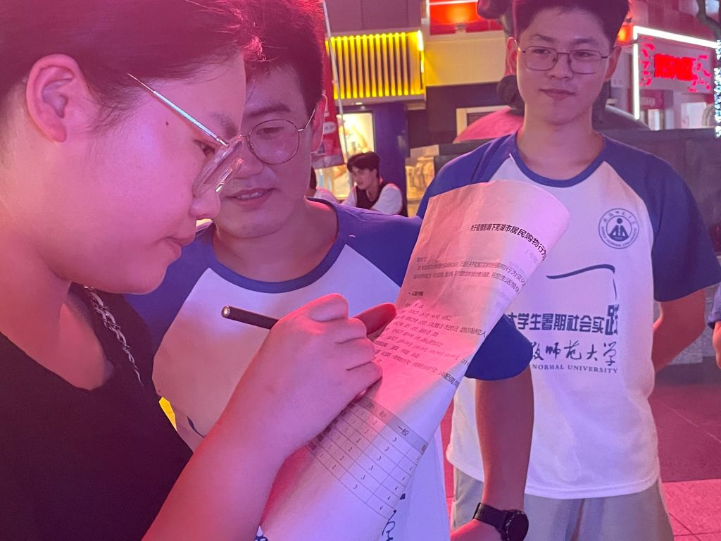 随着夜幕降临,灯火辉煌的街头早已人头攒动。调研计划经过调整之后,效果达到预期目标,调研活动渐入佳境,短短一个半小时便得到了120余份的有效问卷。看着一份份空白问卷逐渐被填满,队员们的脸上露出欣喜的笑容,他们流下的汗水便是努力的见证。
