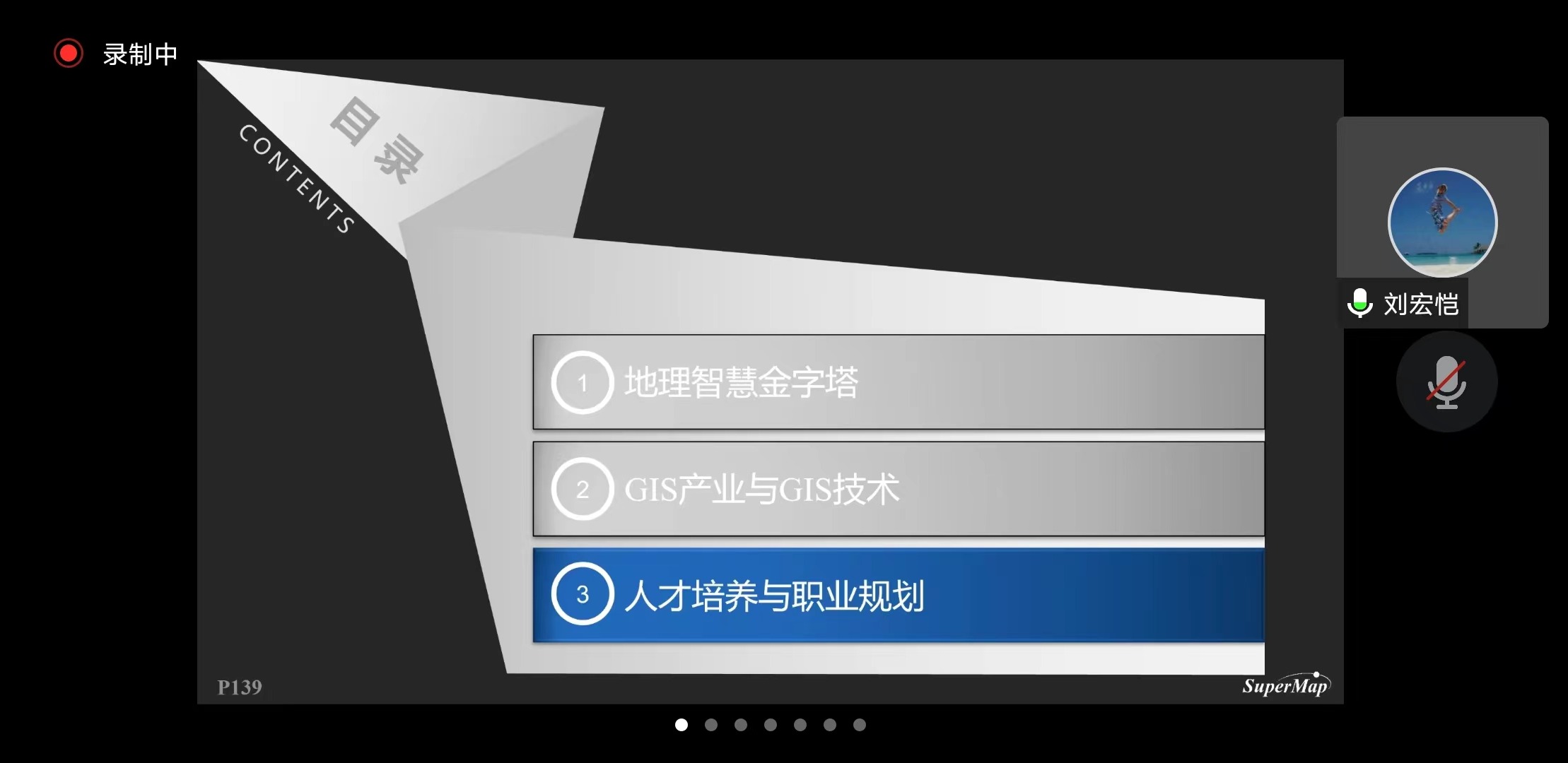 本网讯(魏语菲 陈祥云)11月9日下午,2022级地理信息科学专业在2040302教室举行“地理智慧创新IT价值,职业规划提质人才培养”线上报告会。特邀现任超图软件集团首席品牌官、中国测绘学会仪器装备专业委员会副主任、地图学与地理信息系统专业委员会、职业资格工作委员会、科学普及工作卫委员会委员刘宏恺作报告。会议由地理信息科学专业教师徐培培主持,地理信息科学专业负责人宋立生教授、22级地理信息科学专业全体同学线下参与,19级、20级、21级地理信息科学专业同学线上参与。